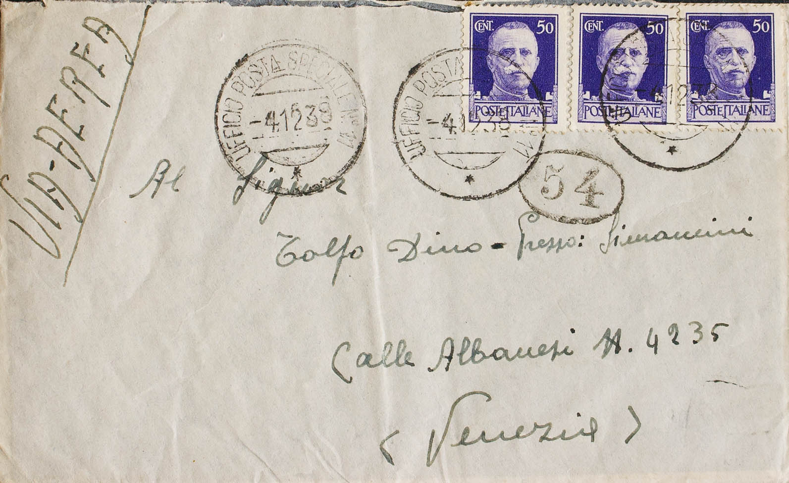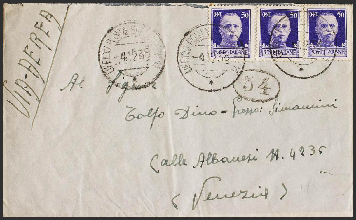 1938. 50 violet cts from Italy, three stamps. Air Mail addressed to VENICE (ITALY). Dater UFFICIO POSTA SPECIALE Nº11 and numeral "54", on the front and arrival back. MAGNIFICENT.