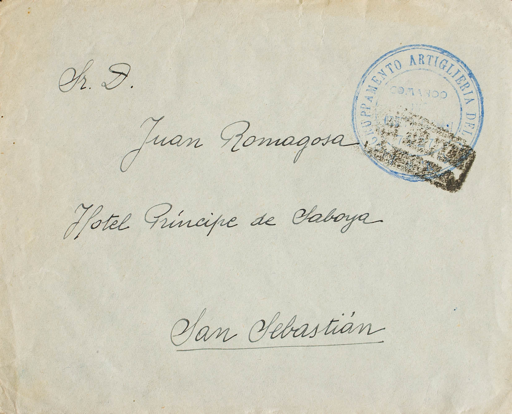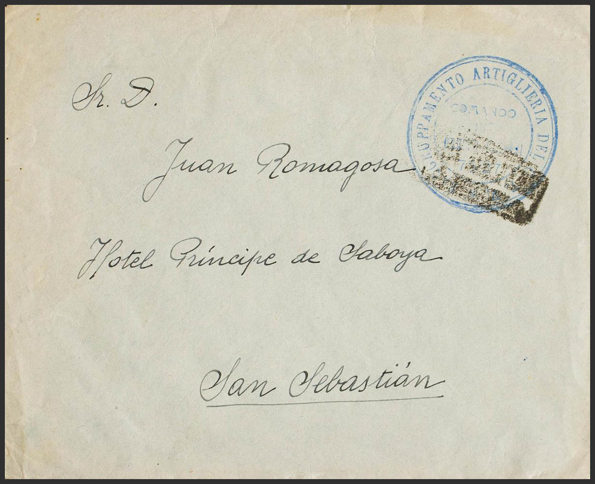 (1937ca). Addressed to SAN SEBASTIAN. Mark RAGRUPPAMENTO ARTIGLIERIA DEL CTV / COMANDO / GRUPPO CANNOSI / 75-27, in purple. MAGNIFICENT.