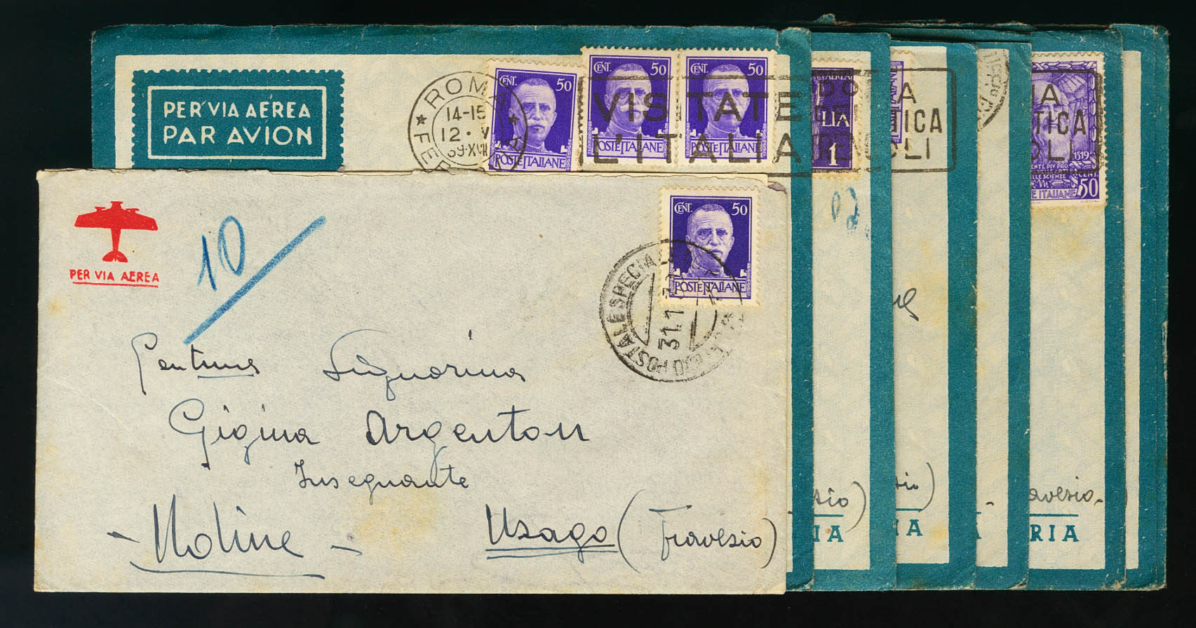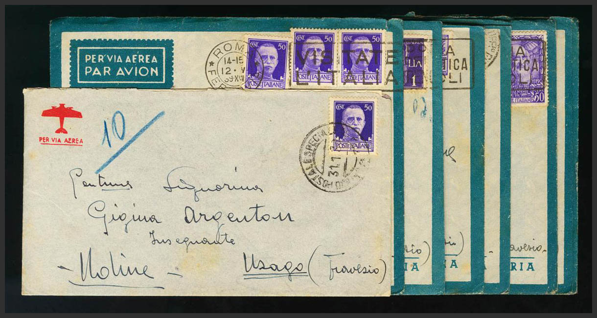 1939. Interesting set-archive of fifty letters (with inner text) written by an Italian volunteer from different parts of Spain between January and May 1939, most of them with postmarks UFFICIO POSTALE SPECIALE (different numbers) with origins such as Palma de Mallorca, Zaragoza , Reus, Puig Moreno, etc, it was a pilot of the Legionary Aviation, since the origins coincide with aerodromes where these units were established. MAGNIFICENT AND EXTRAORDINARILY RARE SET, IDEAL FOR THE STUDY OF THIS SECTION.