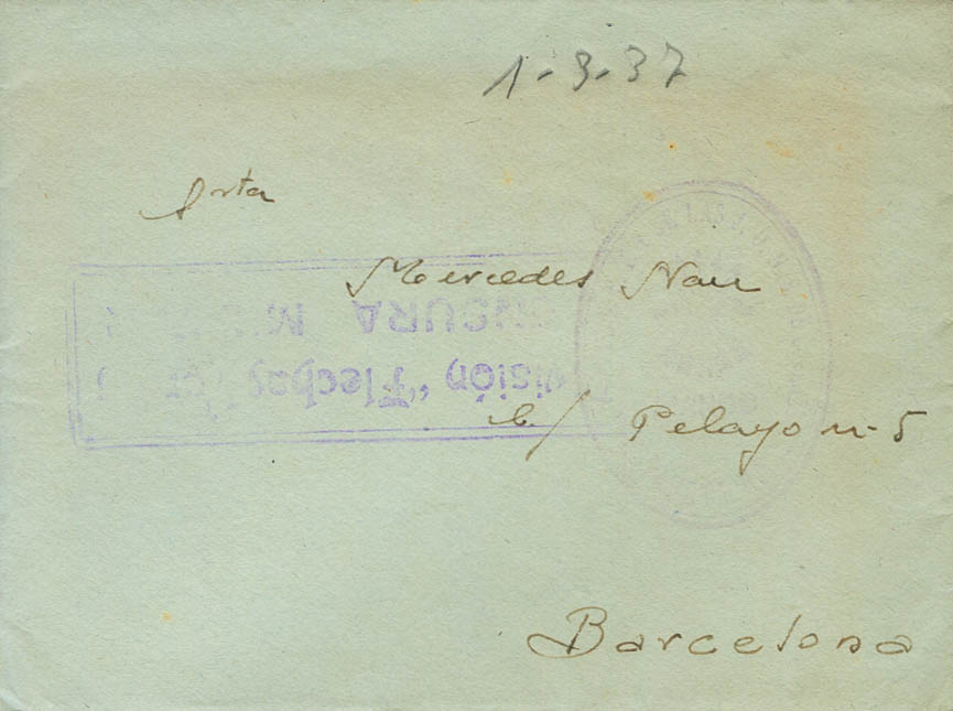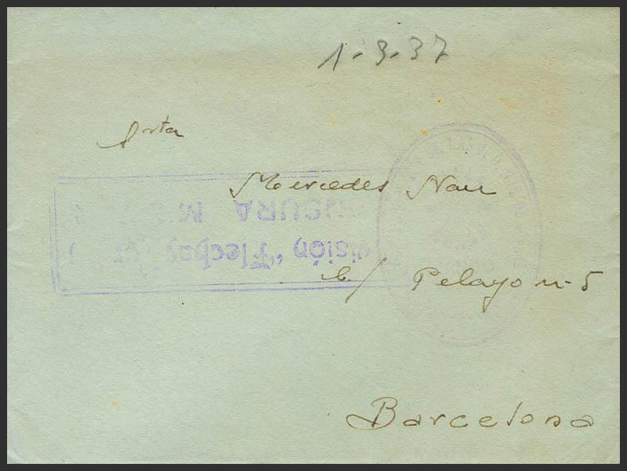 (1937ca). Addressed to BARCELONA. Franchise brand (light stamping) and DIVISION FLECHAS VERDES / MILITARY CENSOR, in violet. MAGNIFICENT AND RARE.