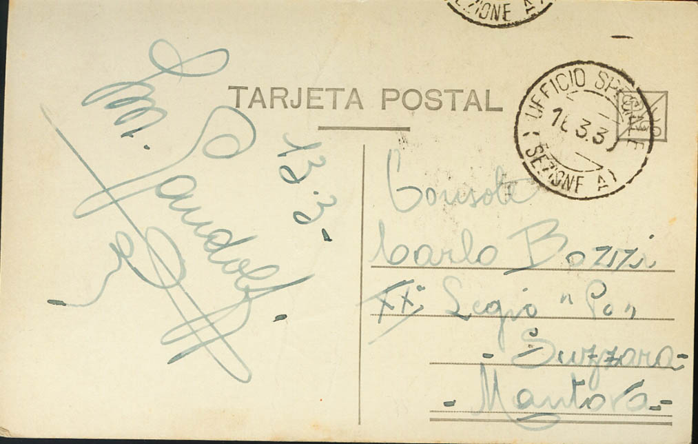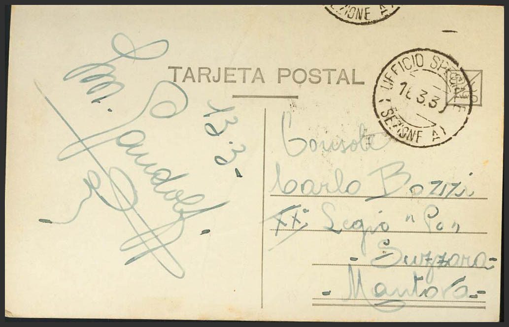 1939. Postcard from AVILA addressed to SUZZARA (ITALY). Dater UFFICIO SPECIALE / (SEZIONEA). MAGNIFICENT AND RARE.