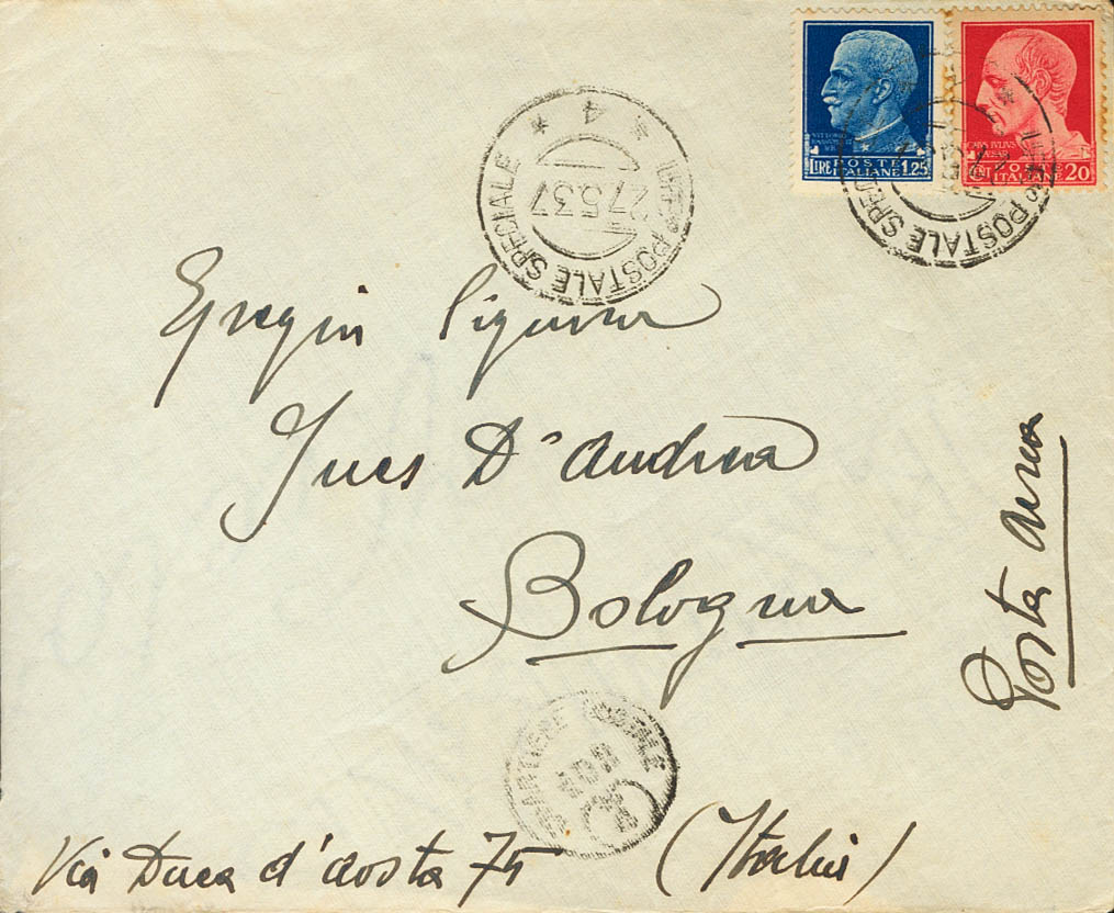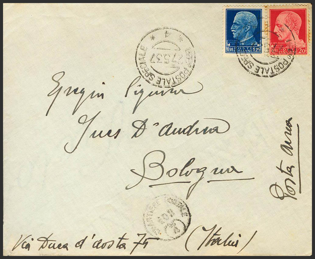 1937. 20 red cts and 1.25 Italian lire. Addressed to BOLOGNA (ITALY). Postmark UFFIº POSTALE SPECIALE / *4* and mark ARTIERE POSTALE / 4 on the front, arrival on the back. MAGNIFICENT.