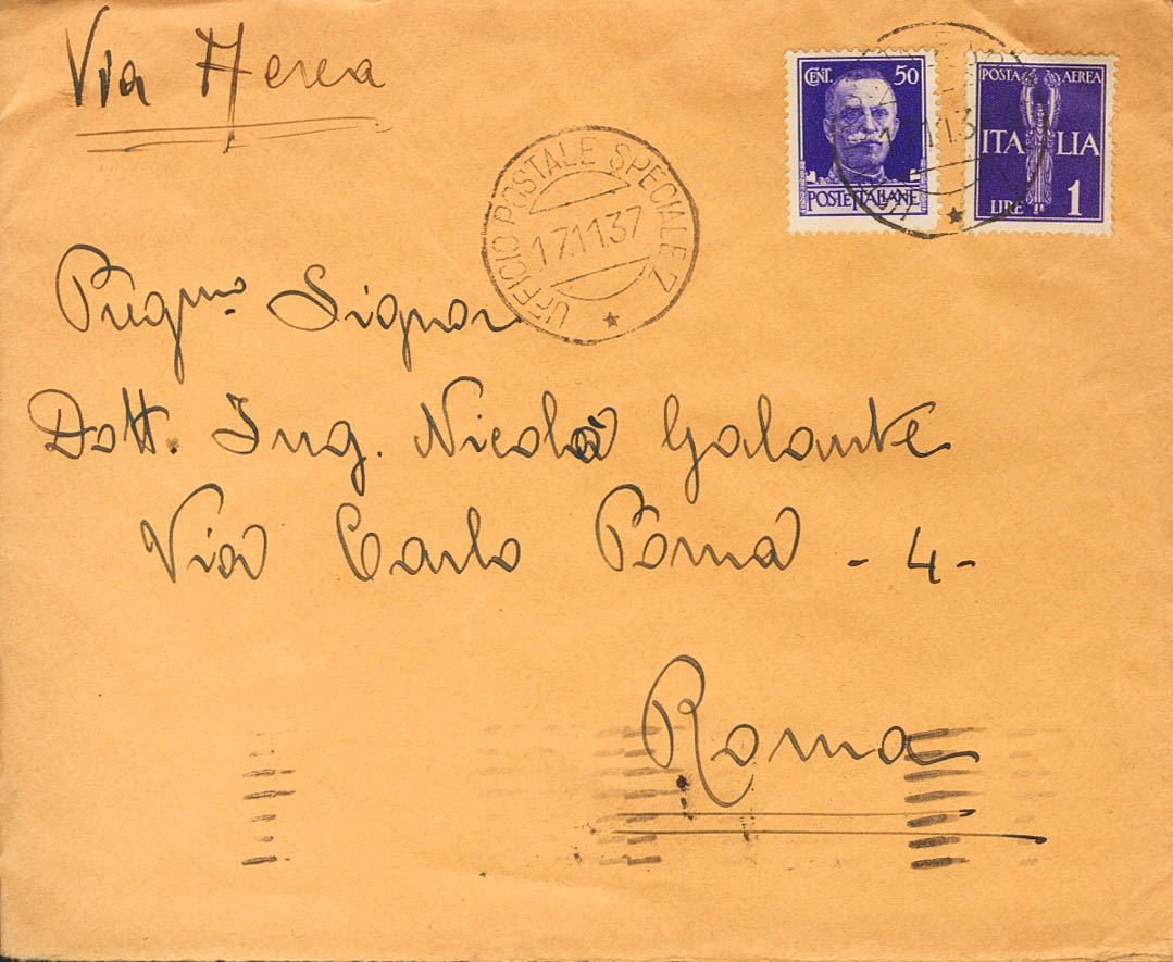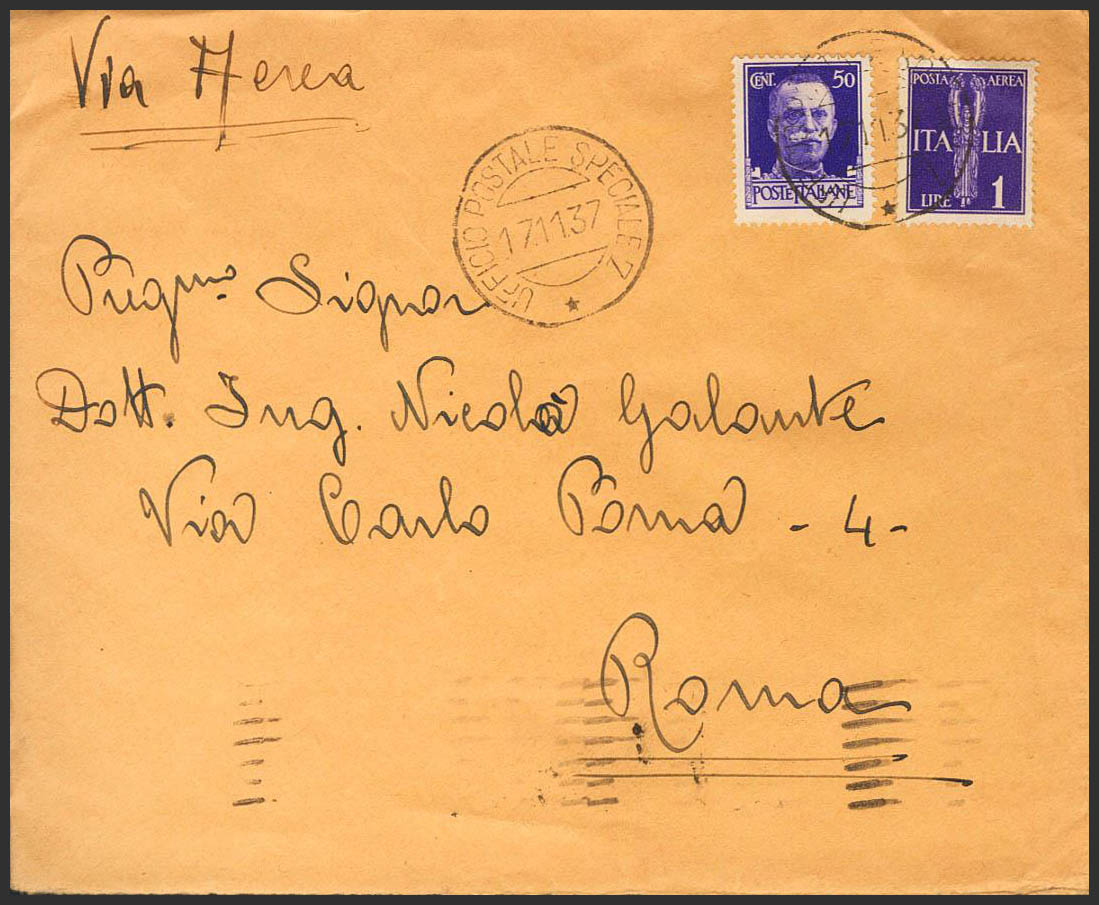 English 1937. 50 cts and 1 lira from Italy. Addressed to ROME (ITALY). Postmark UFFICIO POSTALE SPECIALE 7 and arrival back. MAGNIFICENT.