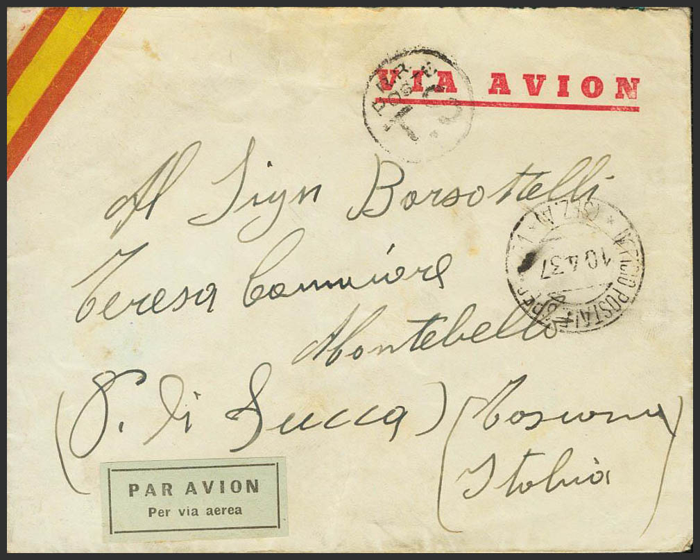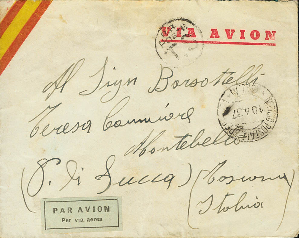English 1937. Addressed to MONTEBELLO (ITALY). Dater UFFICIO POSTALE SPECIALE 1 / *(SEZ. A)* and rate mark, arrival back. MAGNIFICENT AND RARE.
