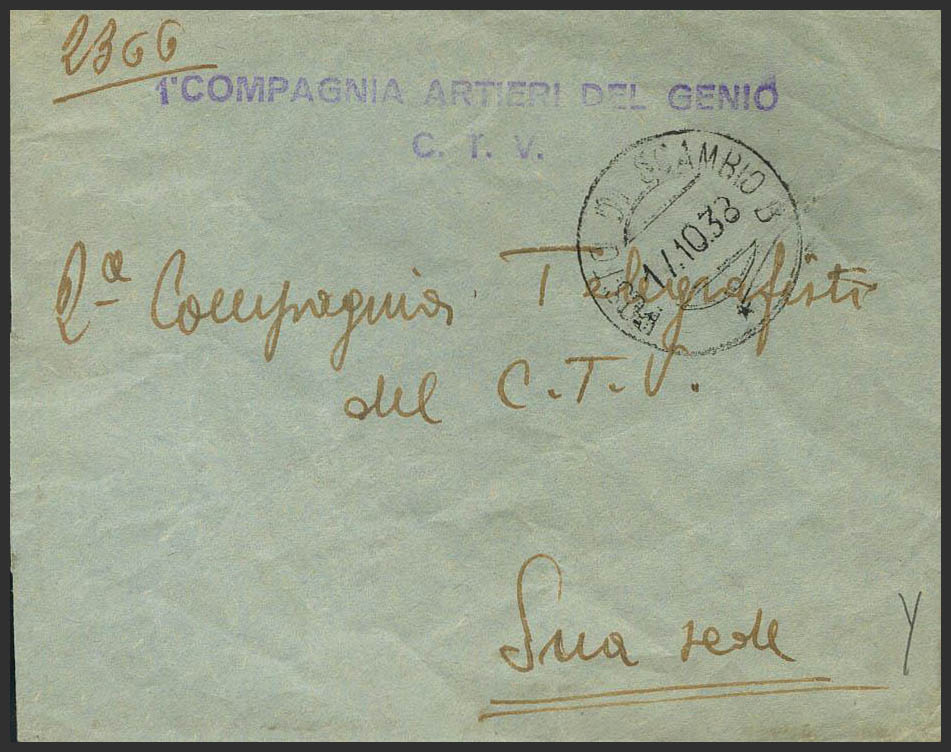 1938. Addressed to the 2nd Company of Telegraph Operators of the CTV POSTO DI SCAMBIO dater and mark 1st COMPAGNIA ARTIERI DEL GENIO / CTV, in violet and on the back a circular mark of the same company. MAGNIFICENT.