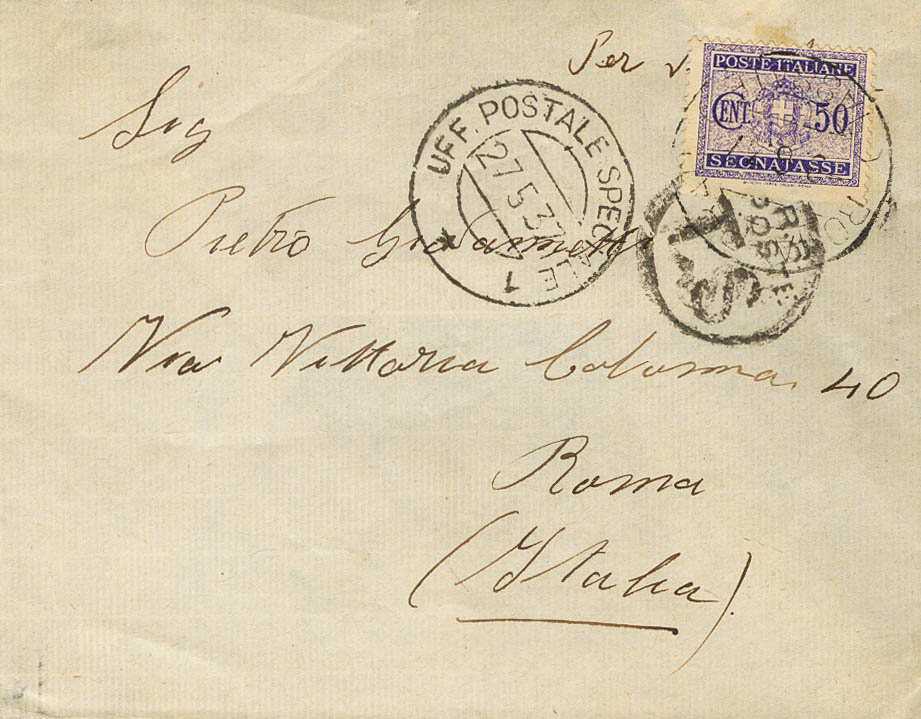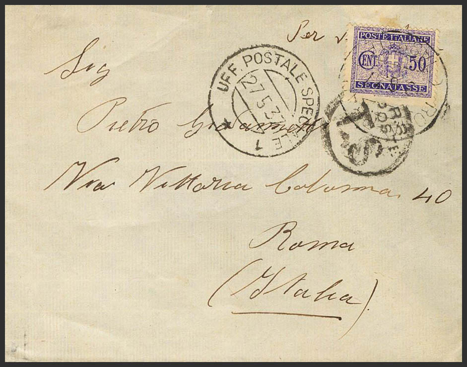 1937. Addressed to ROME (ITALY). Appraised upon arrival, applying a purple 50 cts appraisal stamp, on the front UFFº POSTALE SPECIALE dater / *1* and circular mark RR / POSTE / TS of appraisal. MAGNIFICENT AND RARE.