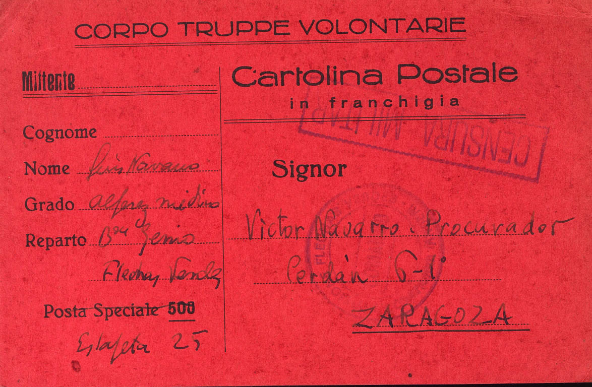 1939. Postcard of the Posta Speciale 500 from "the front" to ZARAGOZA. Mark DIVISIONE FLECHAS VERDES / COMMAND / COMPAGNIA ARTIERI. MAGNIFICENT.