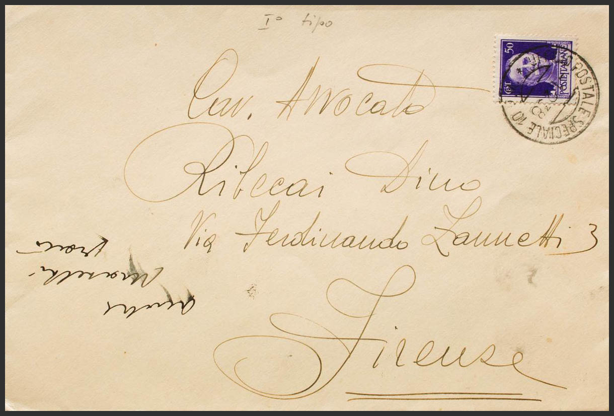 English 1938. 50 cts violet from Italy. Addressed to FLORENCE (ITALY). Postmark UFFICIO POSTA SPECIALE 10. MAGNIFICENT.