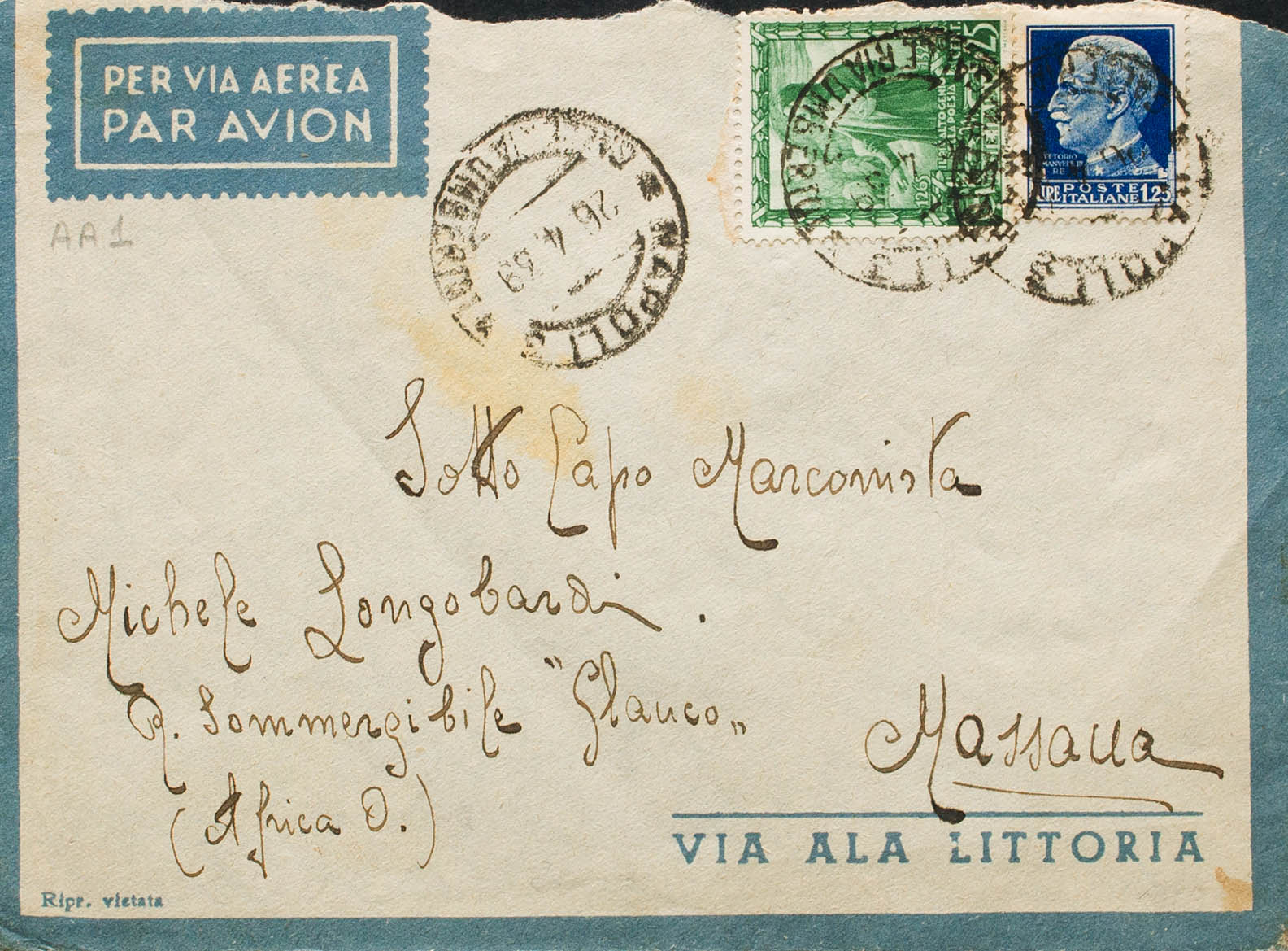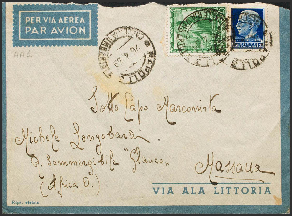 1939. 25 l green and 1´25 l blue. NAPLES to MASAWA (ERITREA). Addressed to the radio operator of the "Glauco" submarine, assigned since 1938 to the Massaua naval base. MAGNIFICENT.