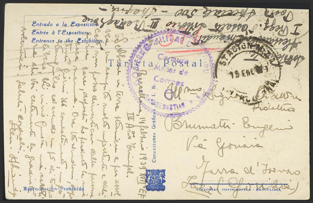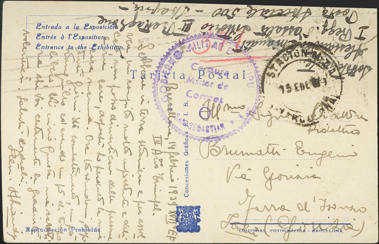 1939. Postcard from BARCELONA to ITALY, sent by a non-commissioned officer of the CTV, with the return address of Posta Speciale 500. Date stamp MZA STATION / (BARCELONA). MAGNIFICENT.