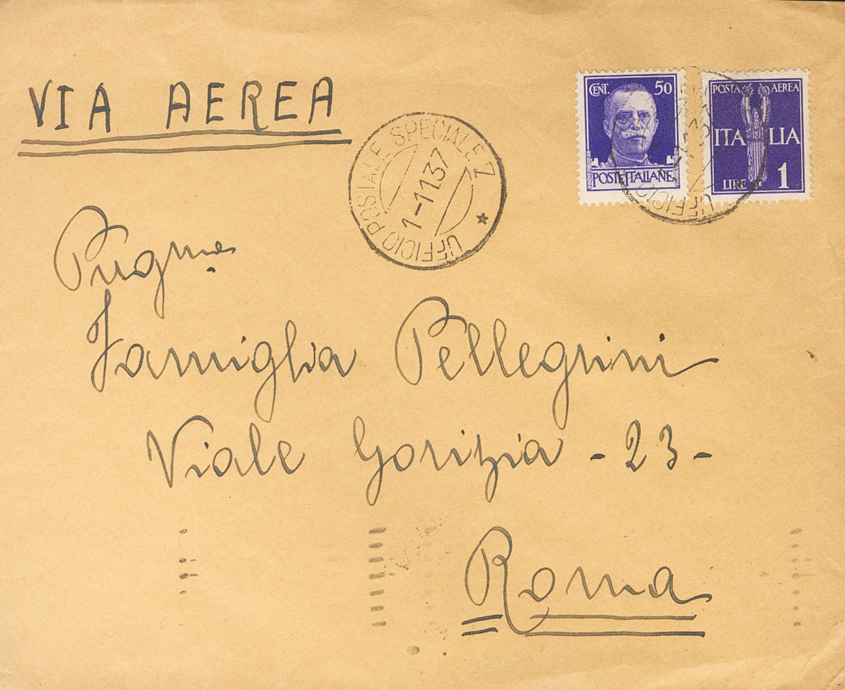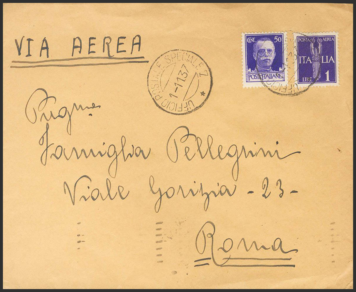 English 1937. 50 cts and 1 l from Italy. Addressed to ROME. Postmark UFFICIO POSTALE SPECIALE 7 and arrival on the back. MAGNIFICENT.