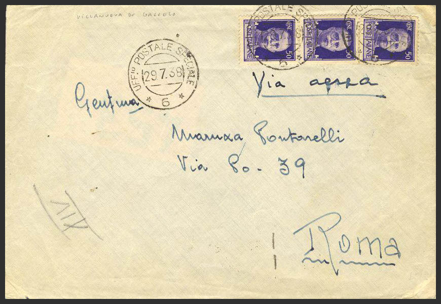 1938. 50 lira cts, string of three. VILLANUEVA FROM GALLEGO to ROME. Postmark UFFIº POSTALE SPECIALE / *6*. On the back arrival. MAGNIFICENT.