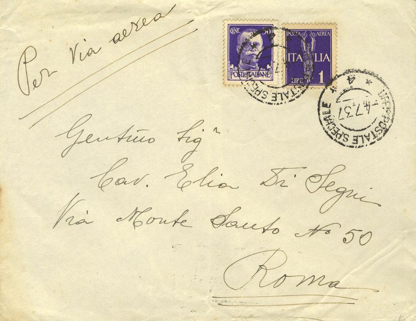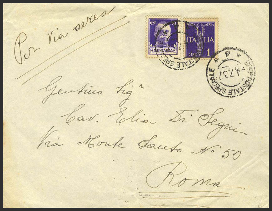 1937. 50 cts and 1 lira. Air letter from Italian Volunteer in Spain to ROME. Postmark UFFIº. POSTAL SPECIAL / *4*. On the back arrival. MAGNIFICENT.