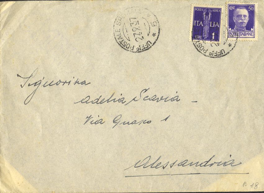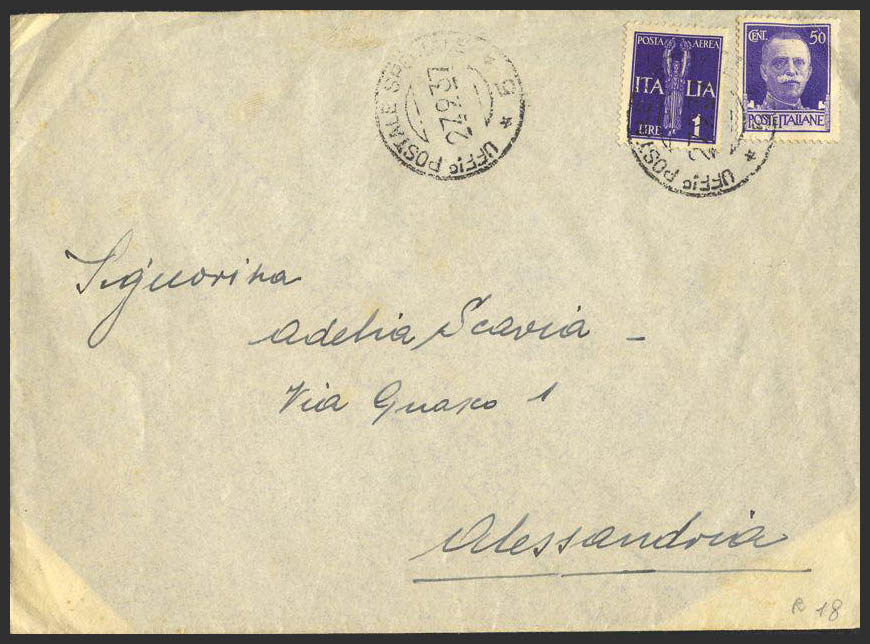 1937. 50 cts and 1 lira. Air letter from Italian Volunteer in Spain to ALESSANDRIA. Postmark UFFIº. POSTAL SPECIAL / *5*. On the back arrival. MAGNIFICENT.