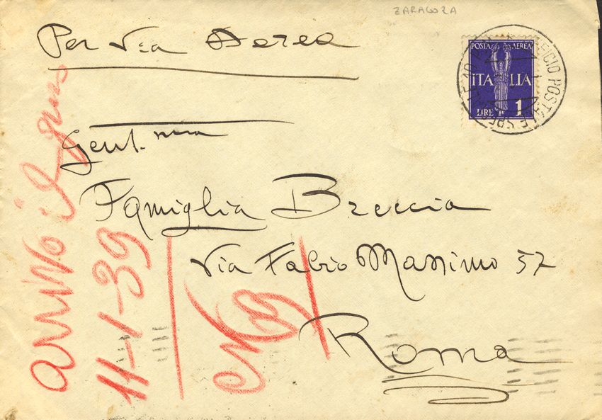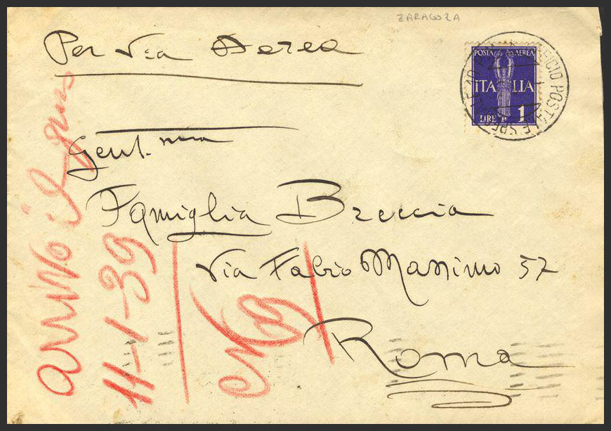 English 1937. 1 lire. Air letter from ZARAGOZA to ROME. Postmark UFFIº. POSTAL SPECIAL 10, airmail. On the back arrival. MAGNIFICENT.
