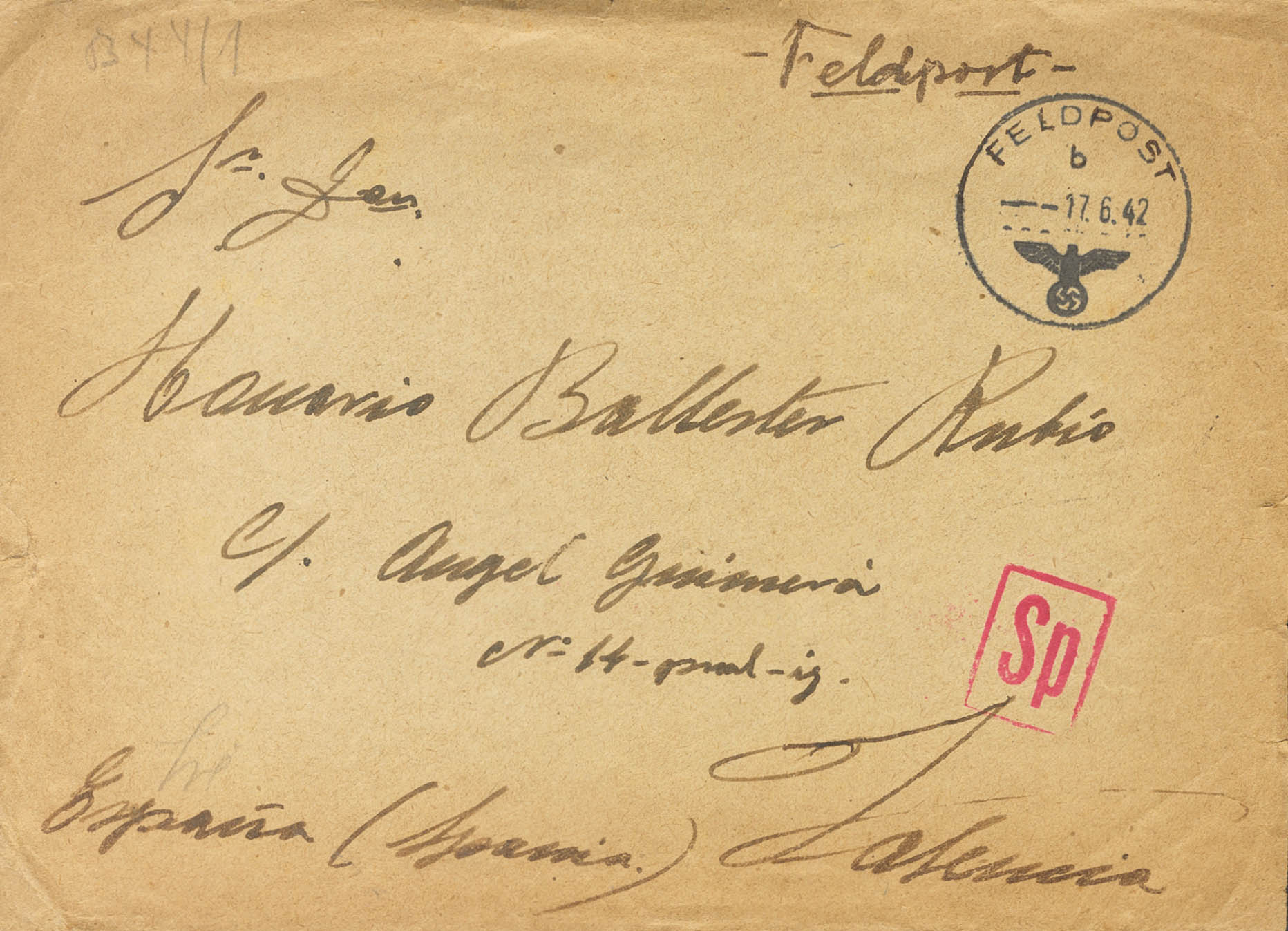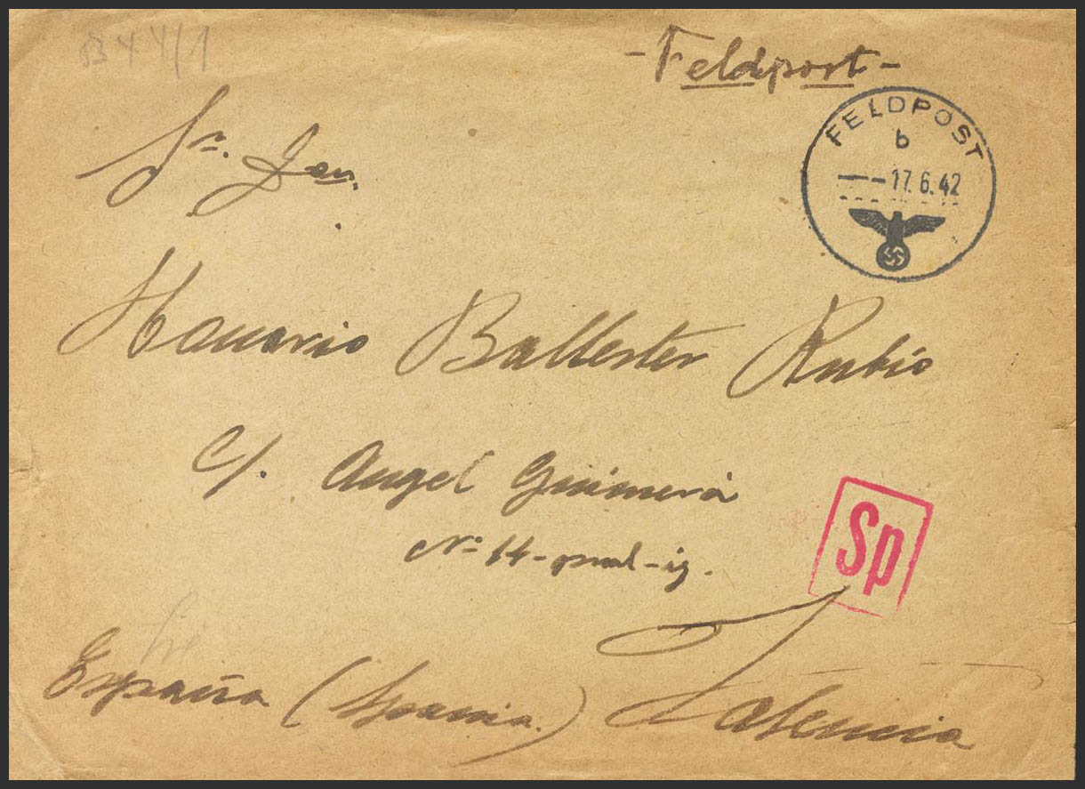 1942. Postcard from FELDPOST Nº00198 to (Headquarters, Division Headquarters) to VALENCIA (text inside). FELDPOST / B date stamp and SP mark, in red. MAGNIFICENT.