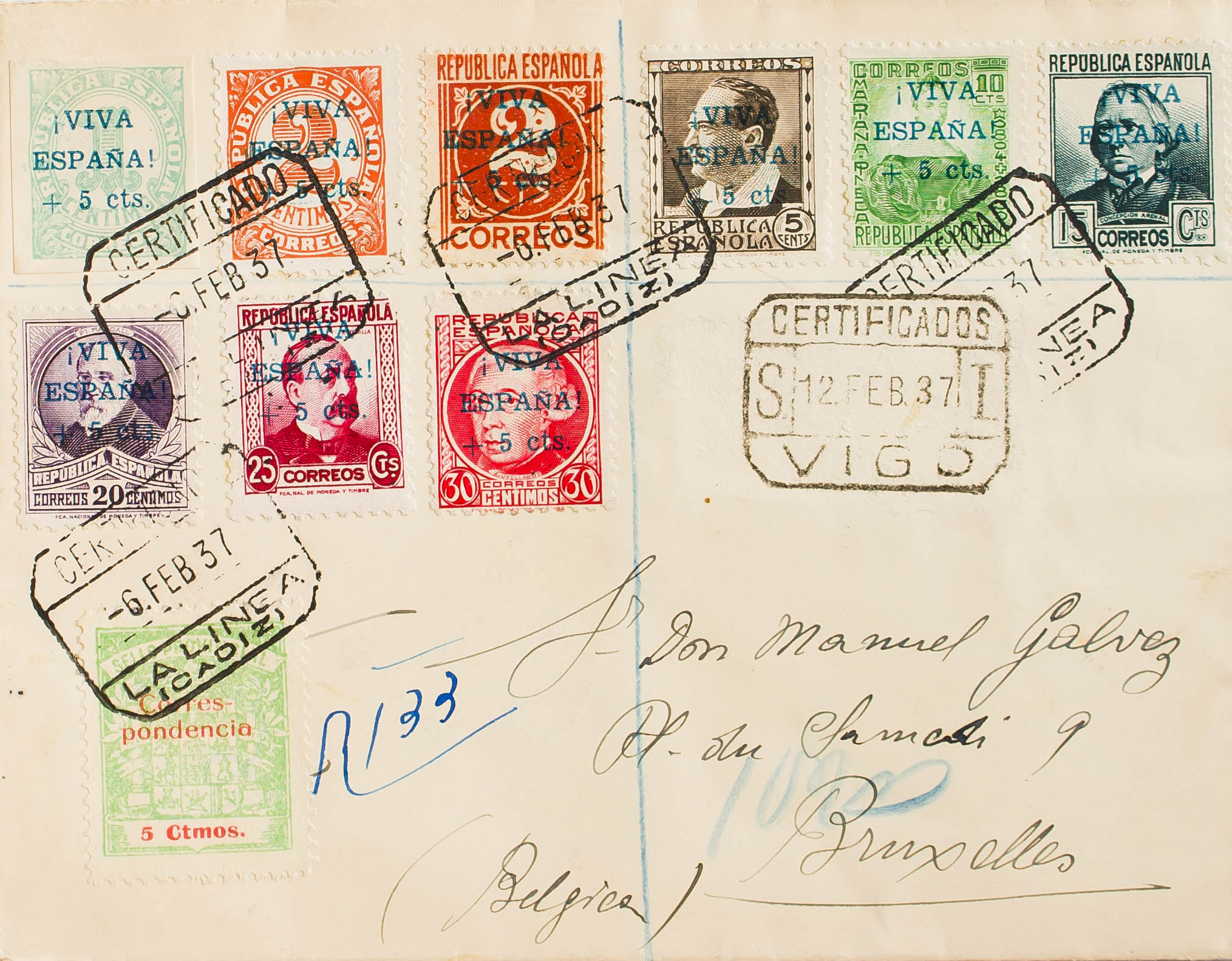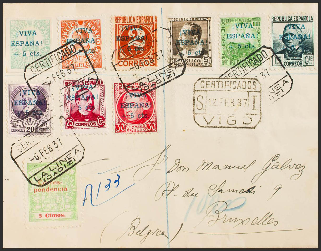19, 21/28. 1937. 1 cts, 2 cts, 2 cts, 5 cts, 10 cts, 15 cts, 20 cts, 25 cts, 30 cts. Certificate from LA LINEA DE LA CONCEPCION to BRUSSELS (BELGIUM). On the back transit. MAGNIFICENT.