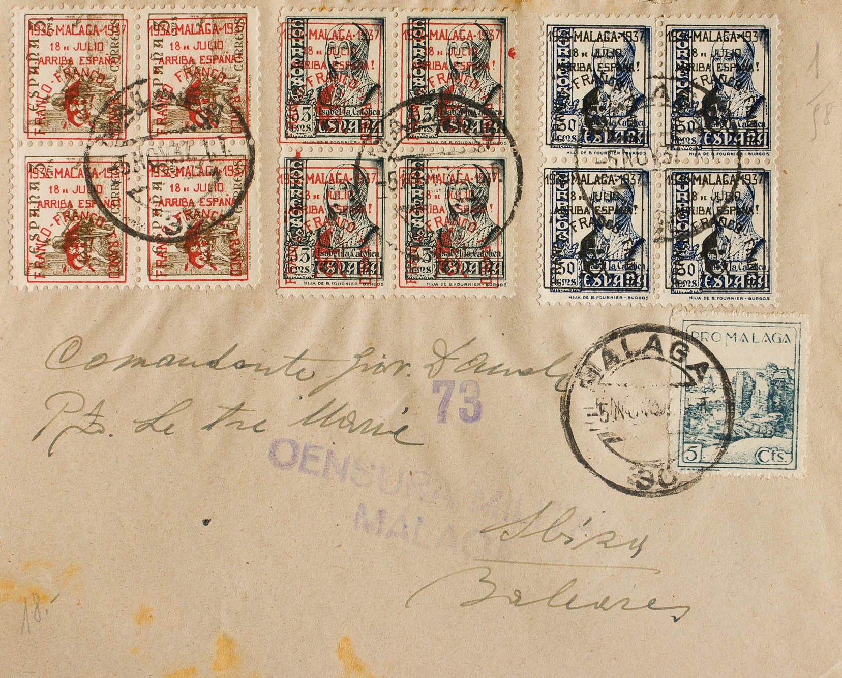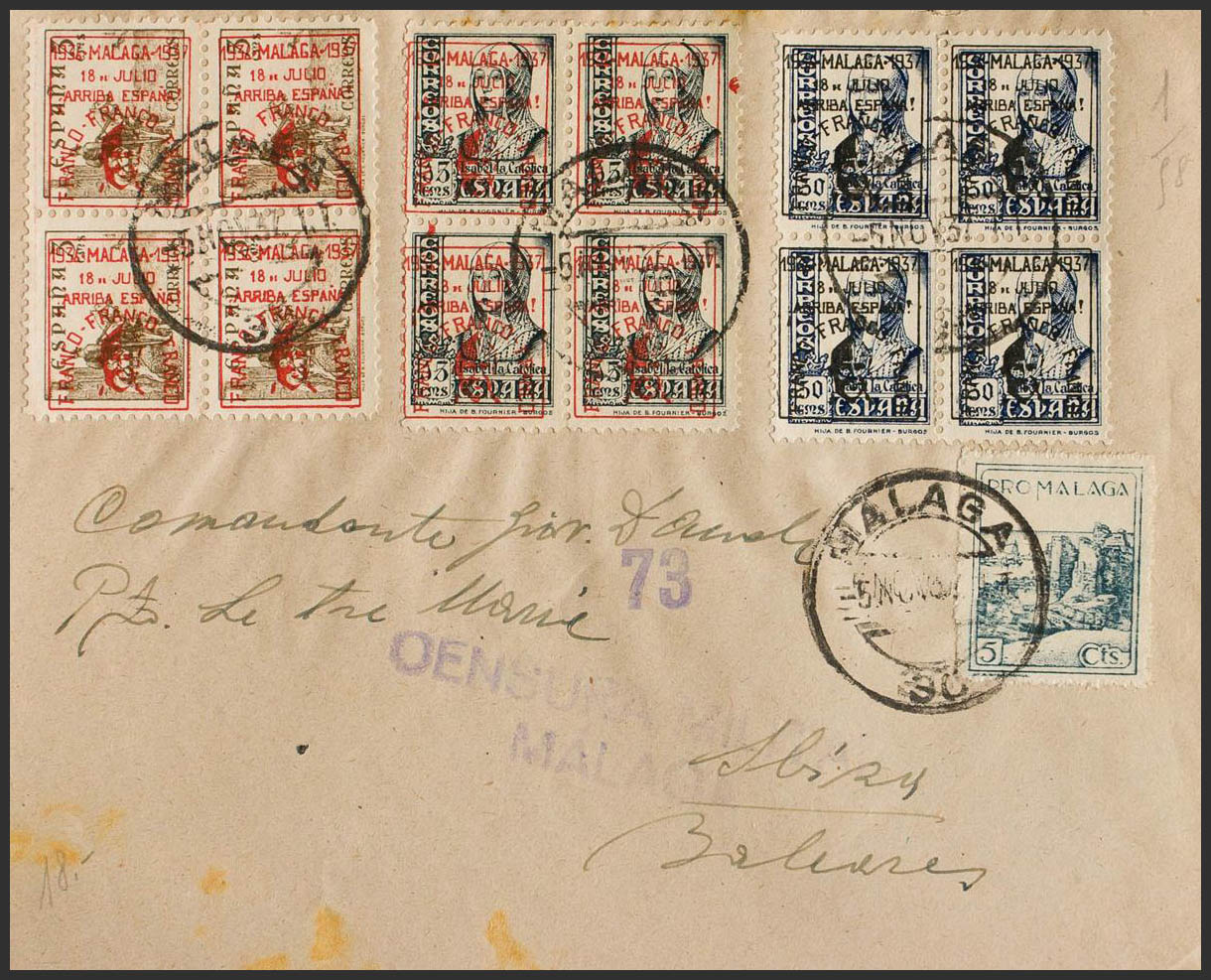 45(4). 1937. 50 cts blue, 15 cts and 5 cts, in blocks of four. MALAGA to IBIZA. On the back arrival. MAGNIFICENT.