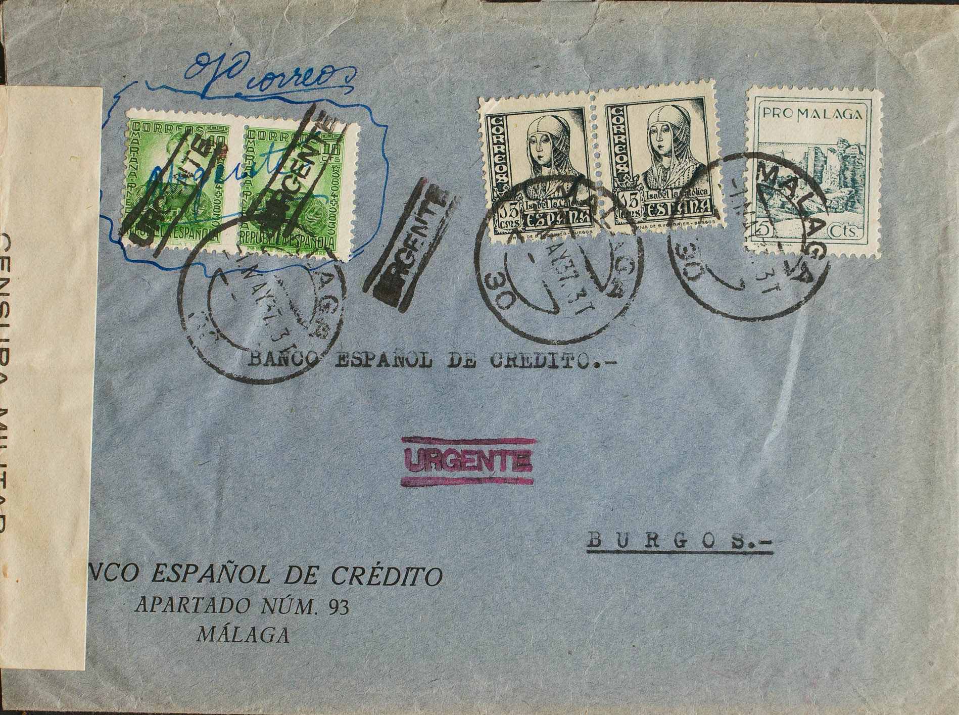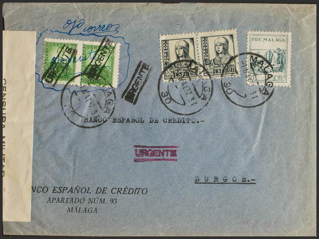 48(2), 820(2). 1937. 10 cts green, pair with URGENT overload (ELP de Málaga), 15 cts slate, pair and Local 5 cts Pro Málaga. Urgent Mail from MALAGA to BURGOS. On the back arrival. MAGNIFICENT AND RARE.