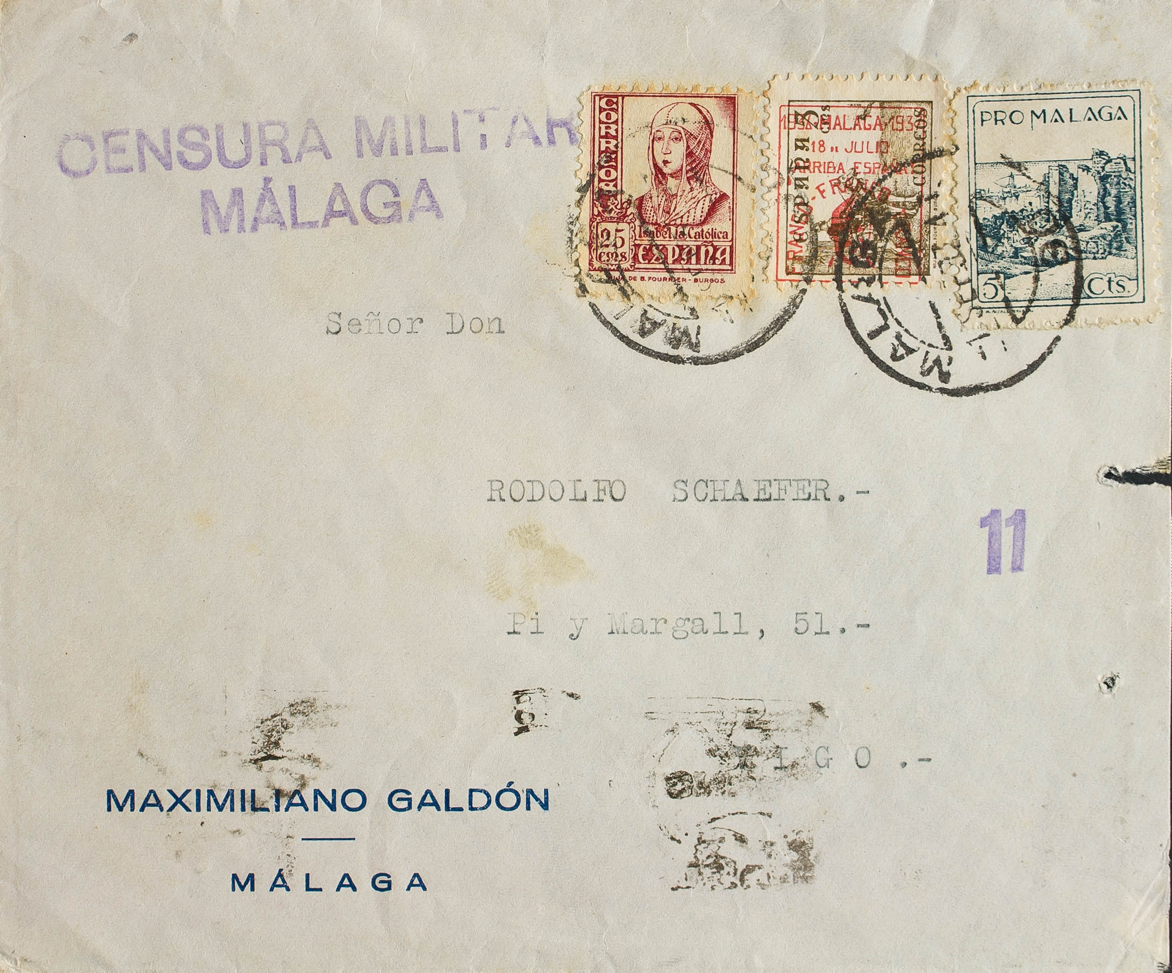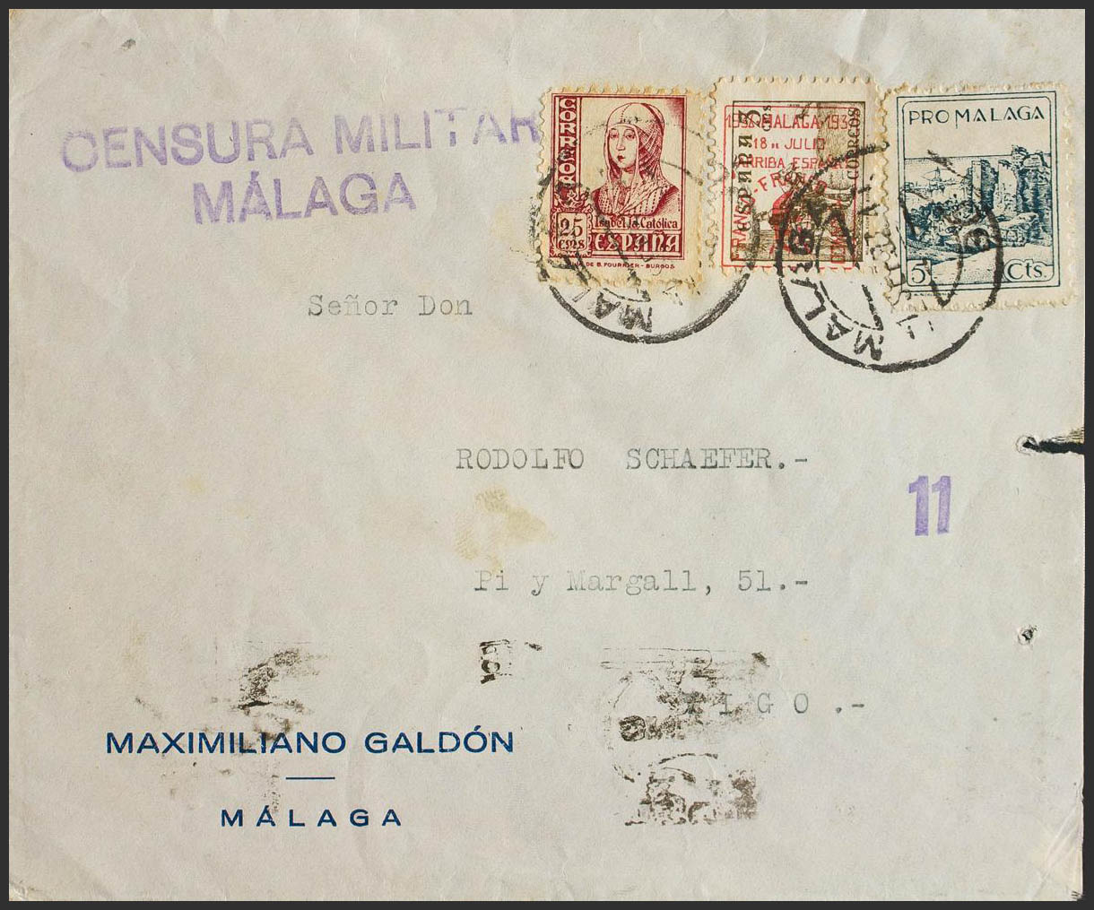 41. 1937. 25 cts, 5 cts Patriotic Local Issue of MALAGA and 5 cts, MALAGA local stamp. MALAGA to VIGO. On the back arrival. MAGNIFICENT.