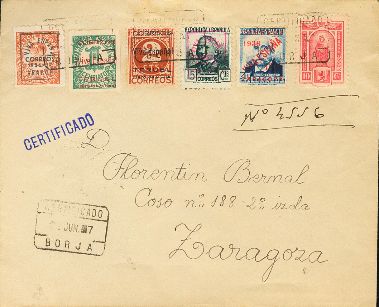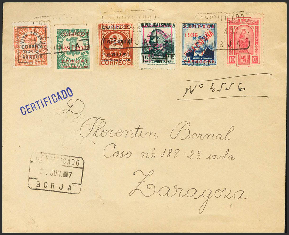 36, 2, 15, Teruel 1/2. 1937. 40 cts blue, 2 cts chestnut red, 15 cts greenish gray, complete series of Teruel and Charity of 10 cts pink. Certificate from BORJA (ZARAGOZA) to ZARAGOZA. On the back arrival. MAGNIFICENT AND RARE.