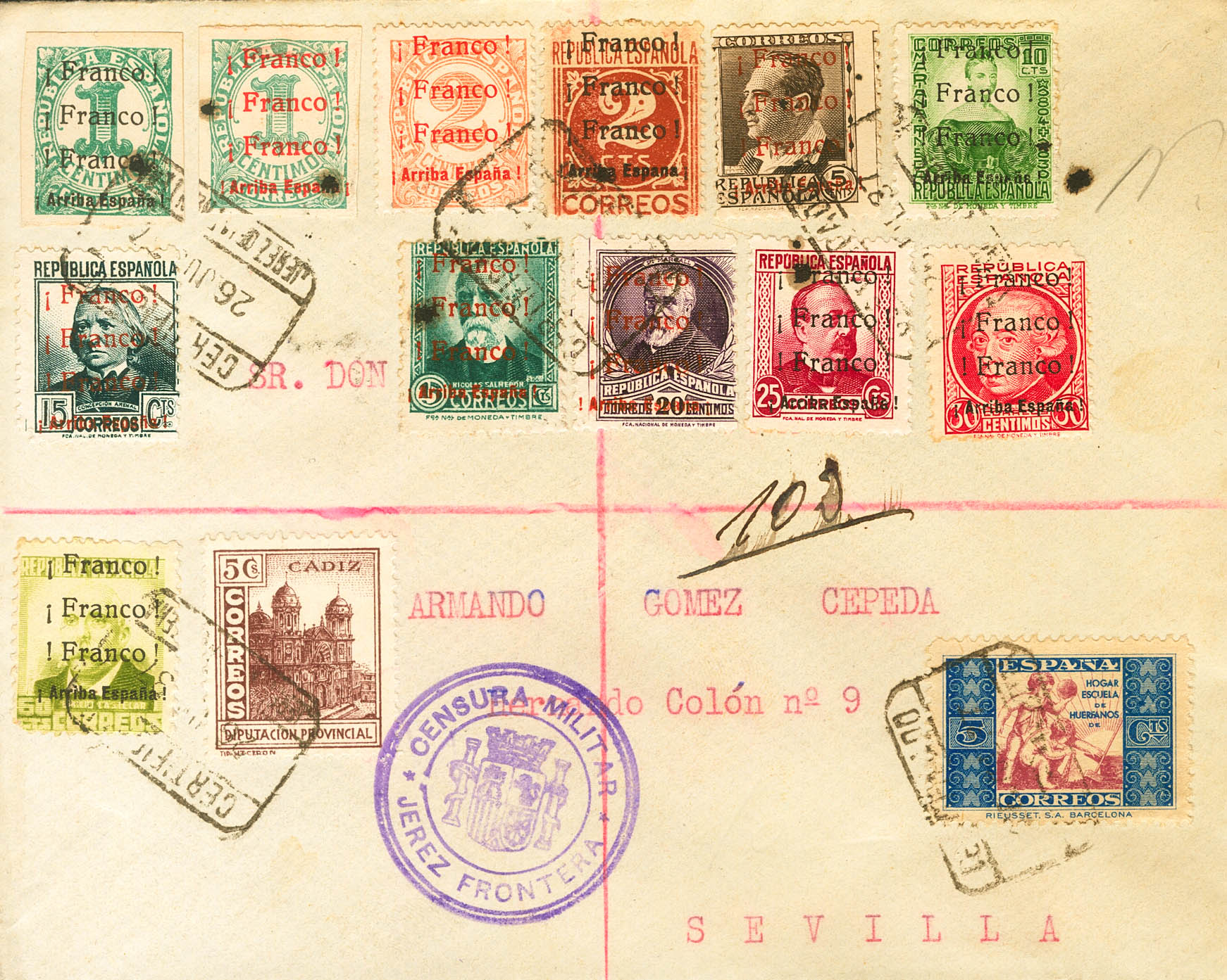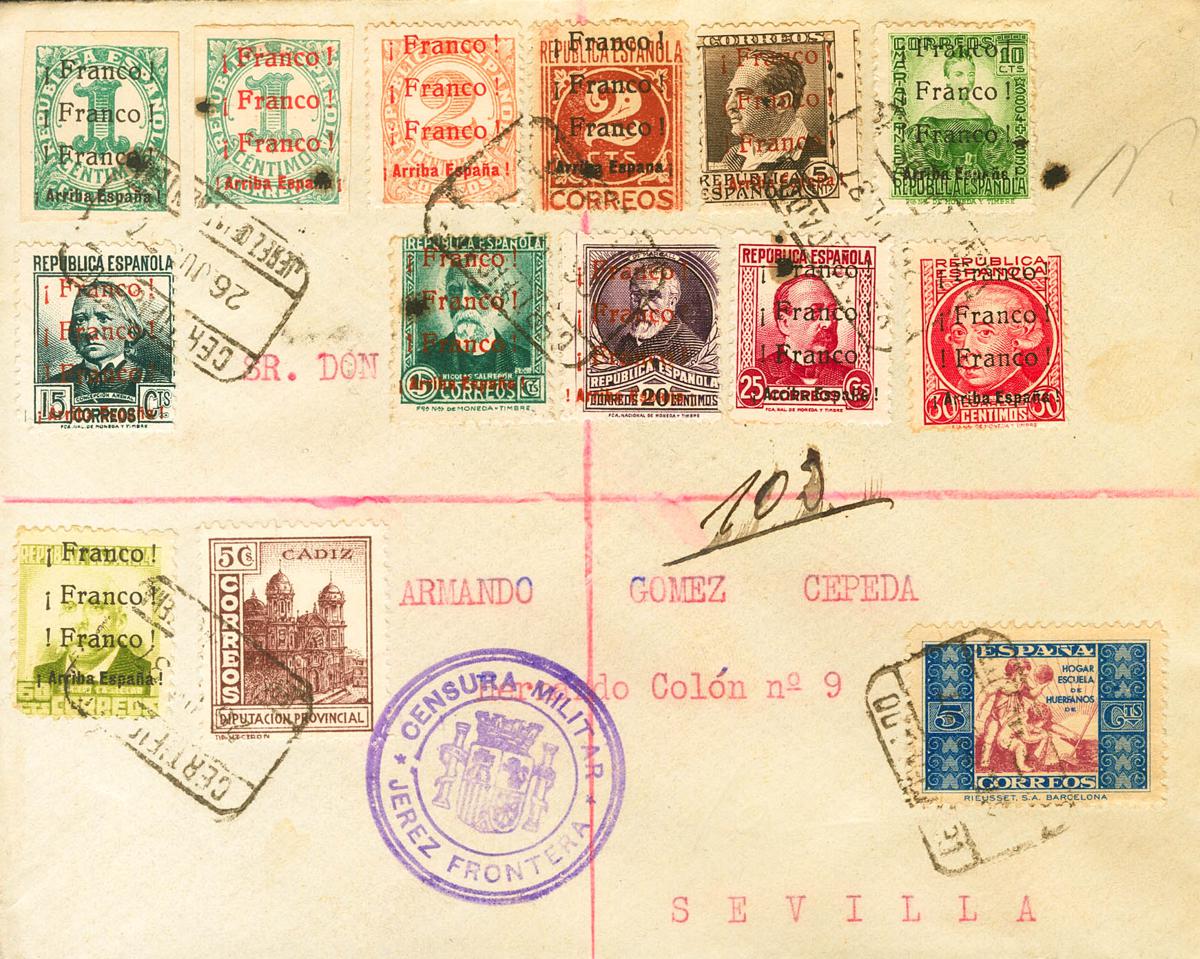 |ENVELOPE| 1/3, 5/12, 14. 1937. Complete set, except for the 2 cents red chestnut and 40 cents blue. Certificate from JEREZ DE LA FRONTERA to SEVILLE. Arrival on the back. MAGNIFICENT.