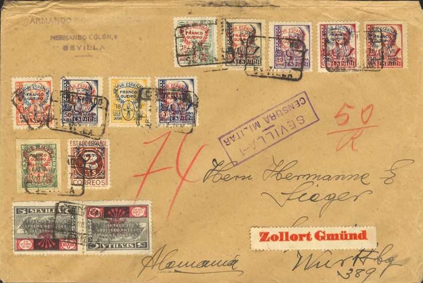 57/68. 1937. Complete series except the 5 cts and 5 cts black TETE-BECHE. SEVILLE to GERMANY. On the back arrival. MAGNIFICENT.