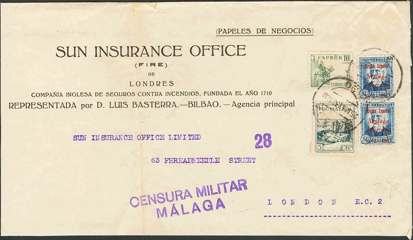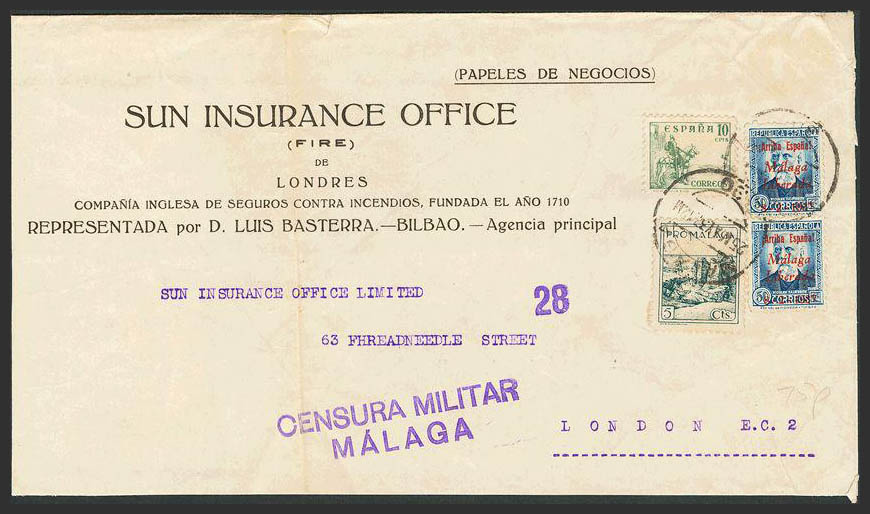 English 21(2). 1937. 5 cts, 10 cts and 50 cts, pair. Business Papers from MALAGA to LONDON. MAGNIFICENT.