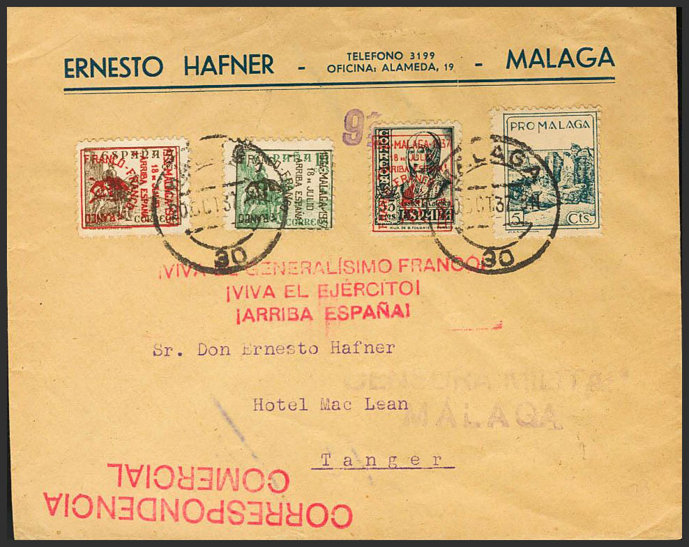 41/43. 1937. 5 cts chestnut, 10 cts green, 15 cts slate and local 5 cts PRO-MALAGA. MALAGA to TANGIER. On the back arrival. MAGNIFICENT.