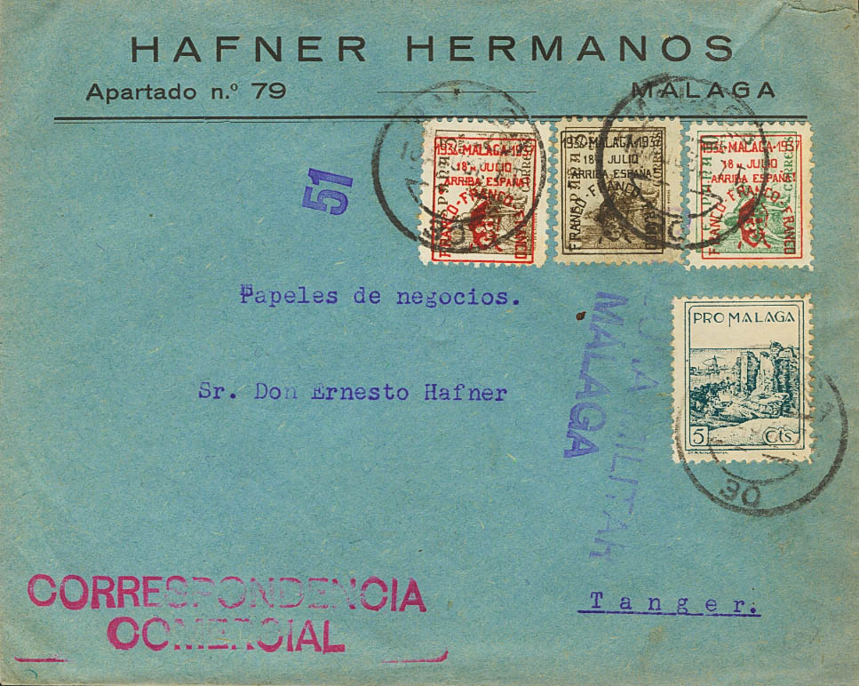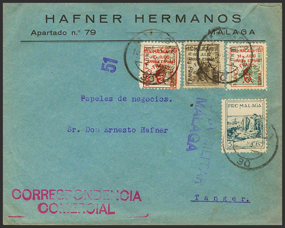 41, 41hcc, 42hcc. 1937. 5 cts brown, 5 cts brown CHANGE OF COLOR IN THE OVERLOAD, in black and 10 cts green CHANGE OF COLOR IN THE OVERLOAD and local 5 cts PRO-MALAGA. MALAGA to TANGIER. On the back arrival. MAGNIFICENT.