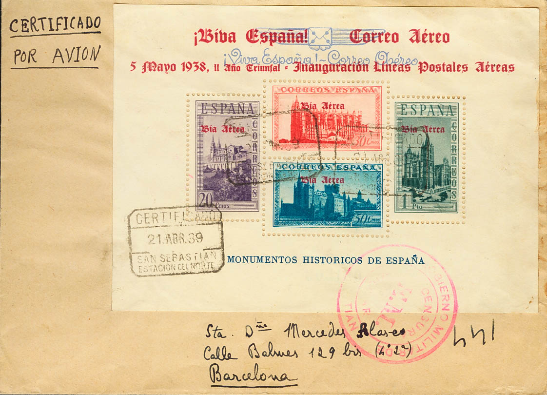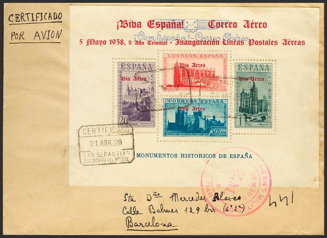 97A. 1939. Block sheet. Certificate from SAN SEBASTIAN to BARCELONA. On the back arrival. MAGNIFICENT AND RARE TRULY CIRCULATED.