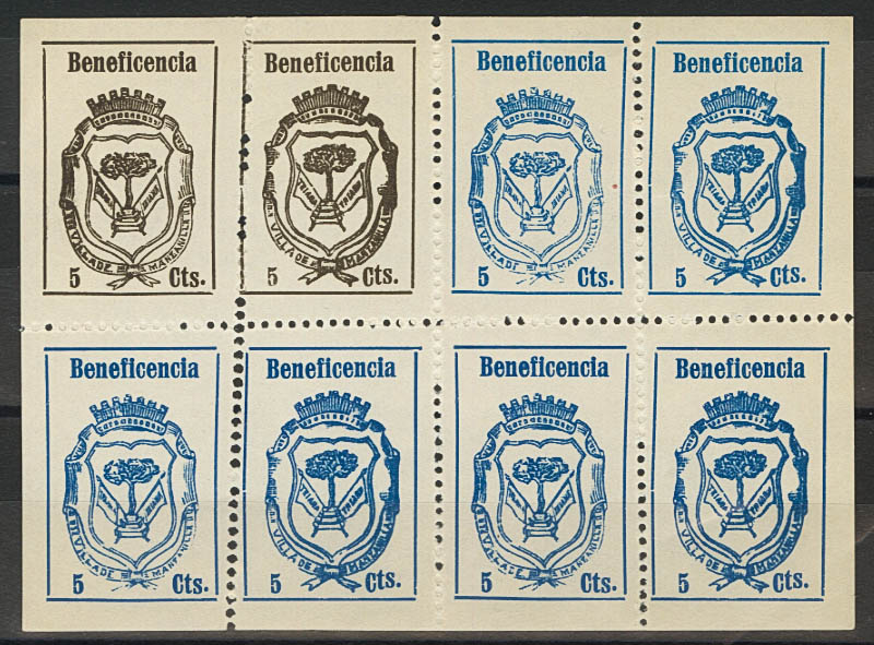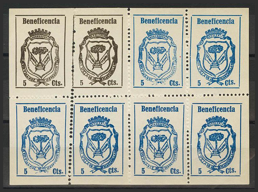 (★)1937. 5 cts black, two stamps and 5 cts blue, six stamps, in complete mini sheet of eight (includes variety in three stamps "TS" ALZADA). CHAMOMILE. MAGNIFICENT. (Phesophi 4, 5a)