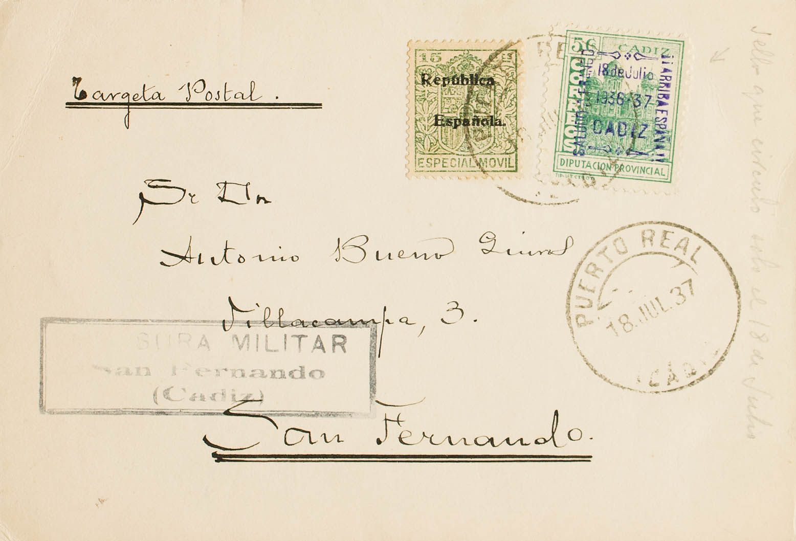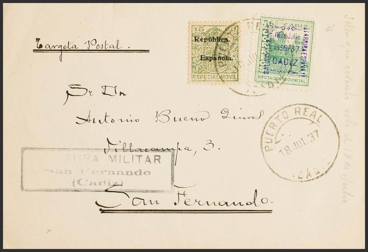 1937. Green 5 cts, Cádiz charity with surcharge GREETING TO FRANCO / JULY 18 / 1936-1937 / CADIZ / UP SPAIN!!, in violet and fiscal 15 cts green with SPANISH REPUBLIC surcharge. Postcard from PUERTO REAL to SAN FERNANDO. On the back arrival. MAGNIFICENT AND VERY RARE POSTAGE.