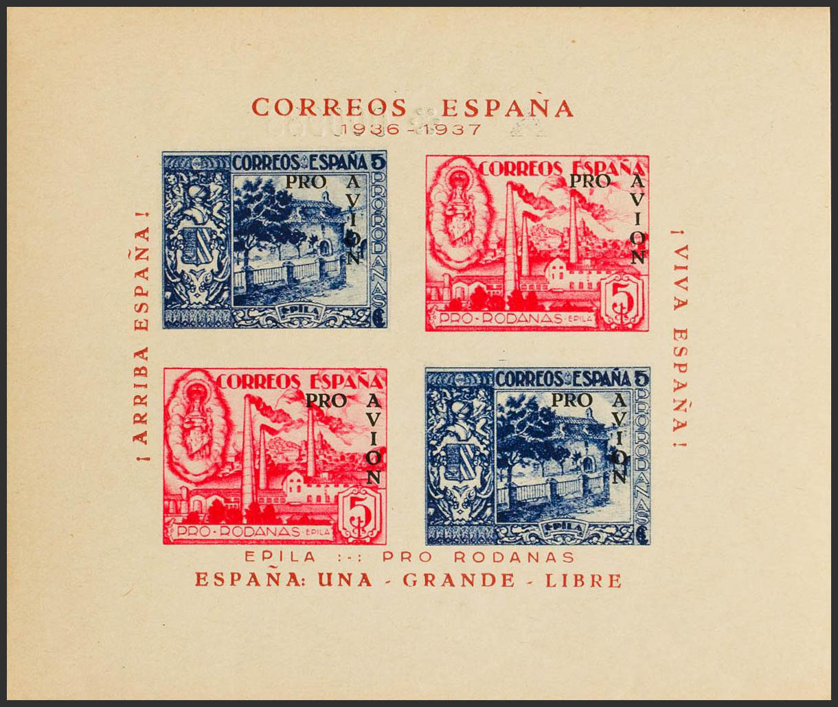 English ★★1937. Block sheet EPILA 5 cts blue + 5 cts pink PRO AVION, in black. MAGNIFICENT. (Phesophi 11)
