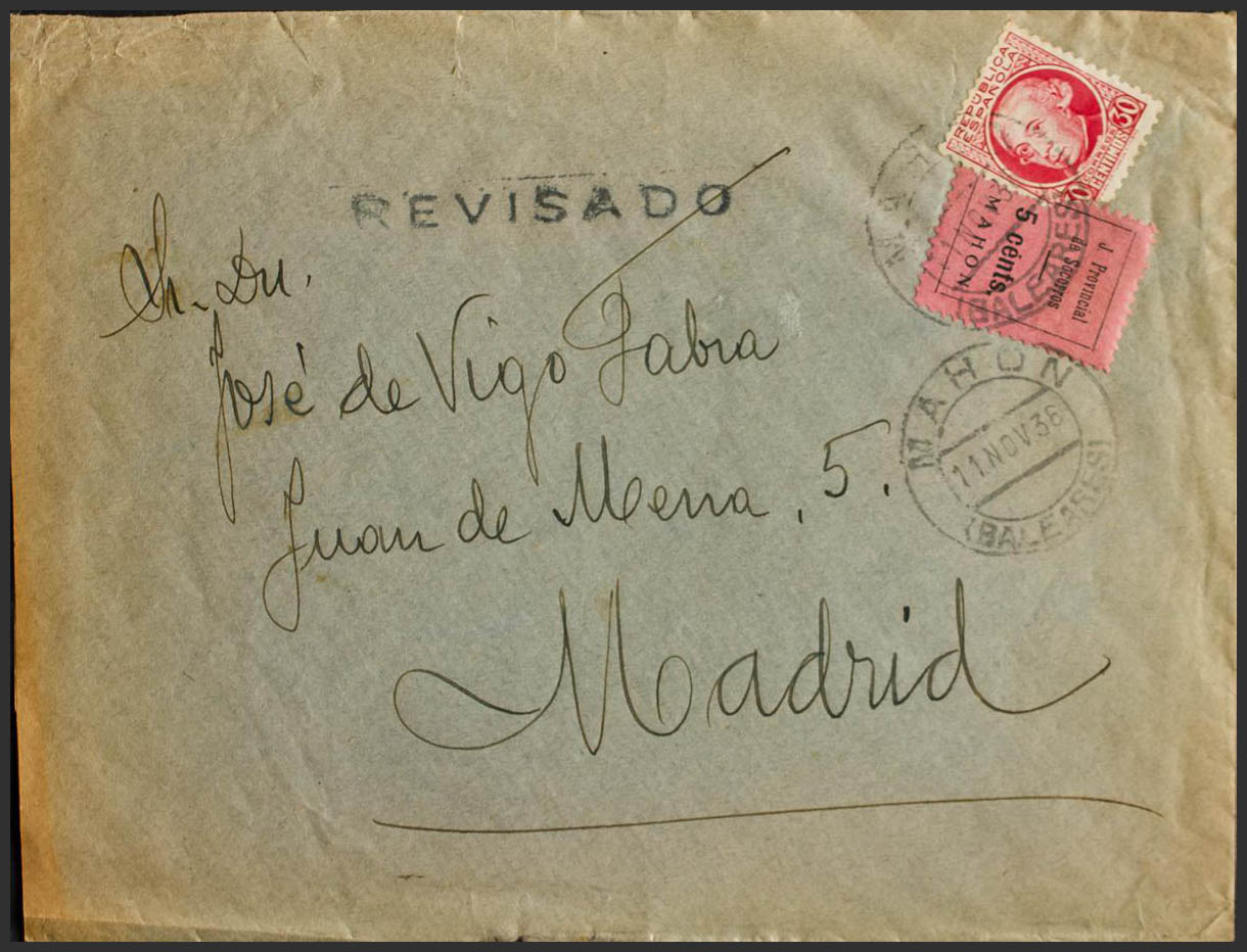 687. 1936. 30 cts carmine and 5 cts pink (Type I) Local JUNTA PROVINCIAL DE RELIEF / MAHON. MAHON to MADRID. MAGNIFICENT. (Phesophi 4)