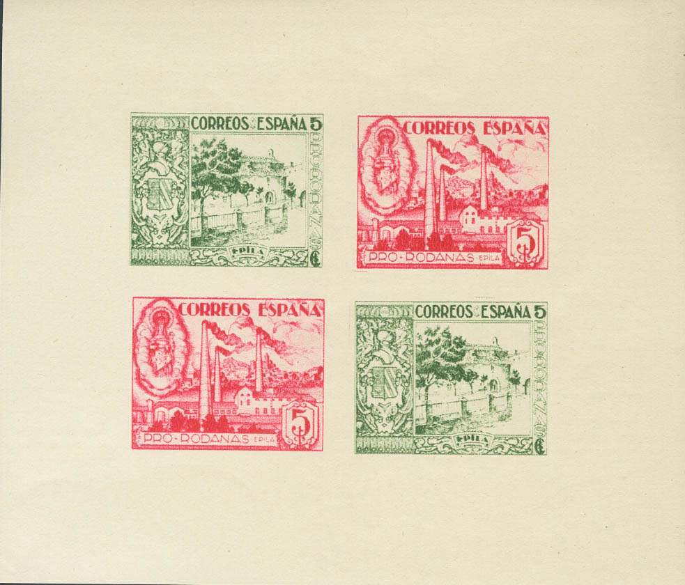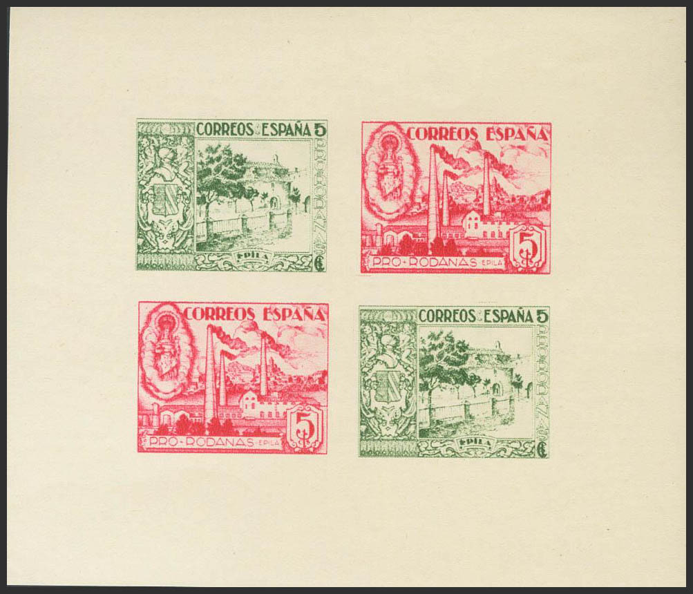 English ★★1937. 5 cts green and 5 cts pink, block sheet WITHOUT INSCRIPTIONS. EPILA (ZARAGOZA). MAGNIFICENT AND RARE. (Fesofi 7D, Allepuz 6)