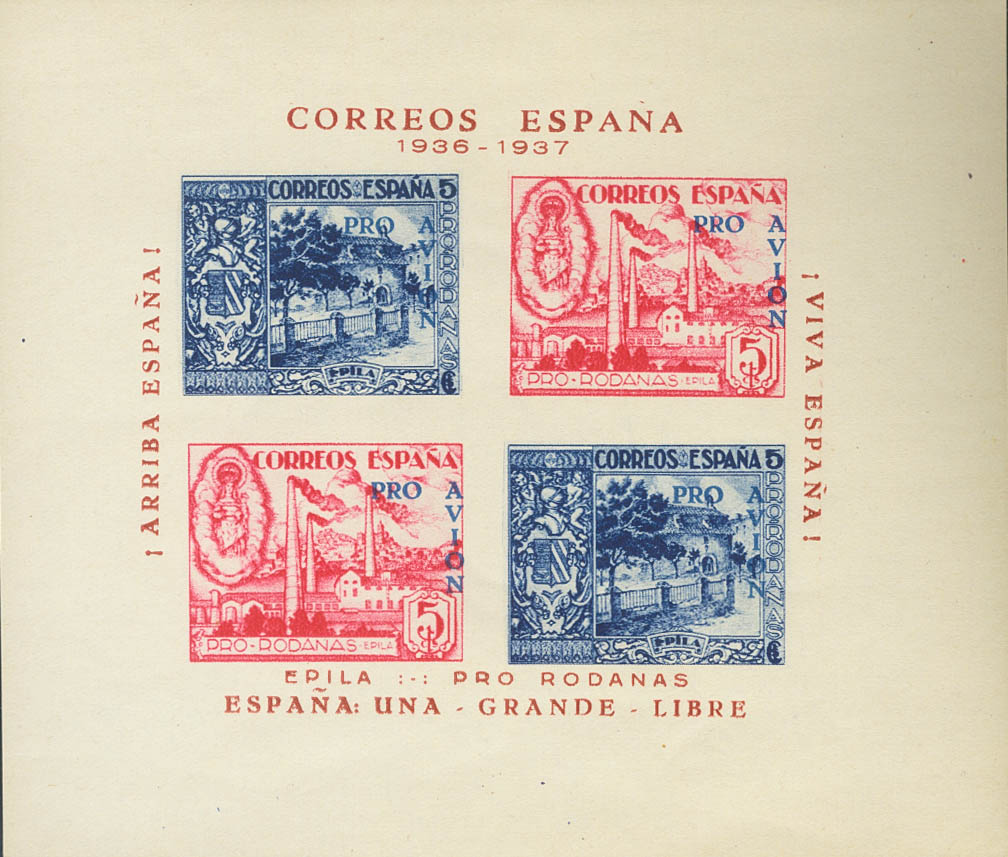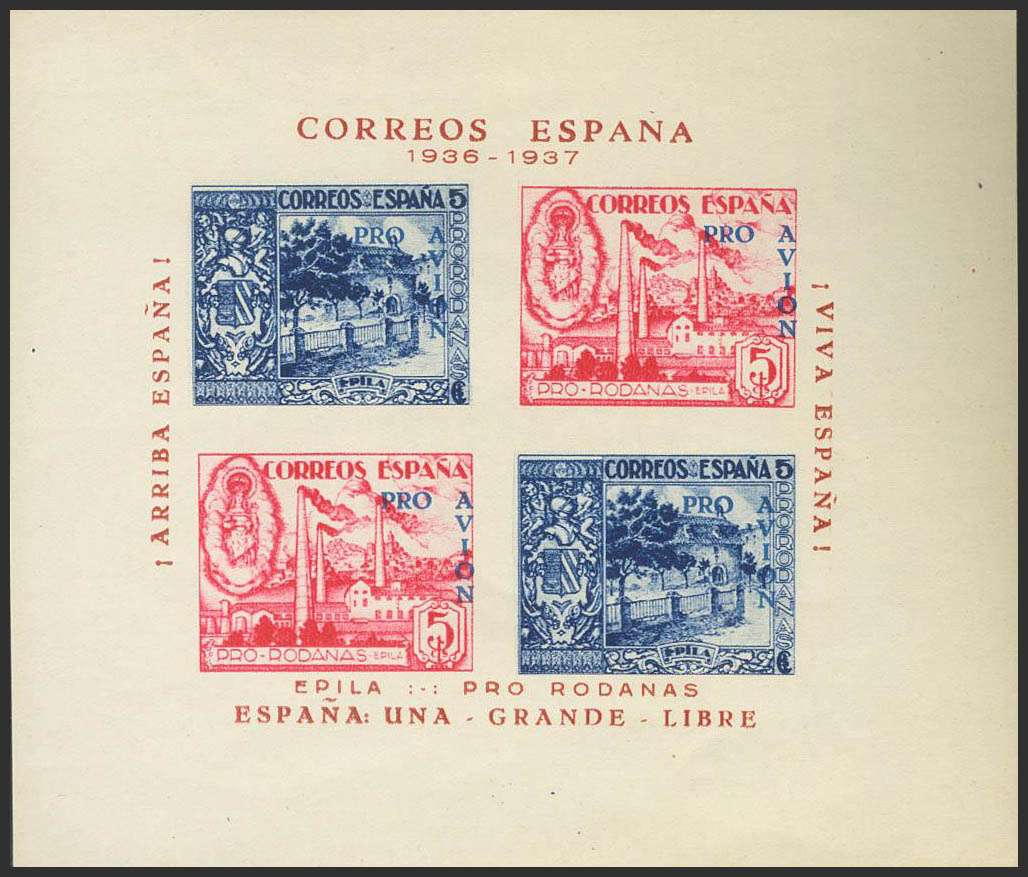★★1937. 5 cts blue and 5 cts pink, block sheet with in blue. MAGNIFICENT AND RARE. (Fesofi 12, Allepuz 28)