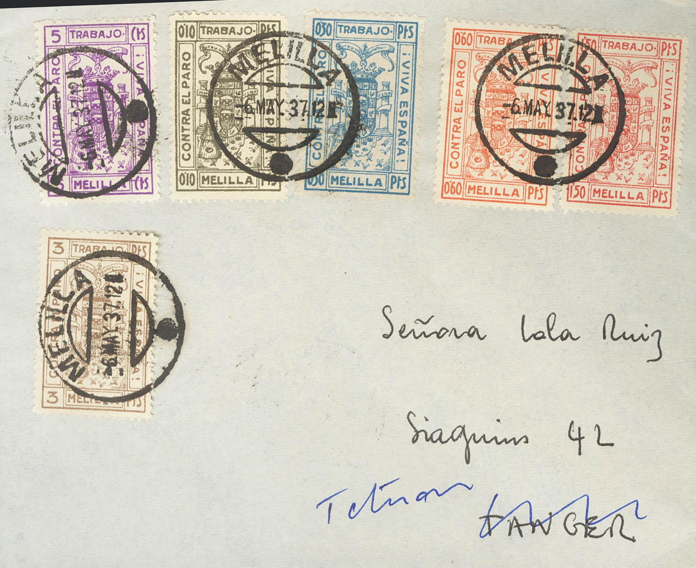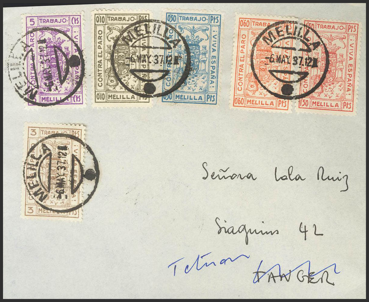 1937. Complete series AGAINST THE COLD. Philatelic letter from MELILLA to TANGER, forwarded to TETUAN. On the back arrival. MAGNIFICENT AND RARE. (Allepuz 1/6)