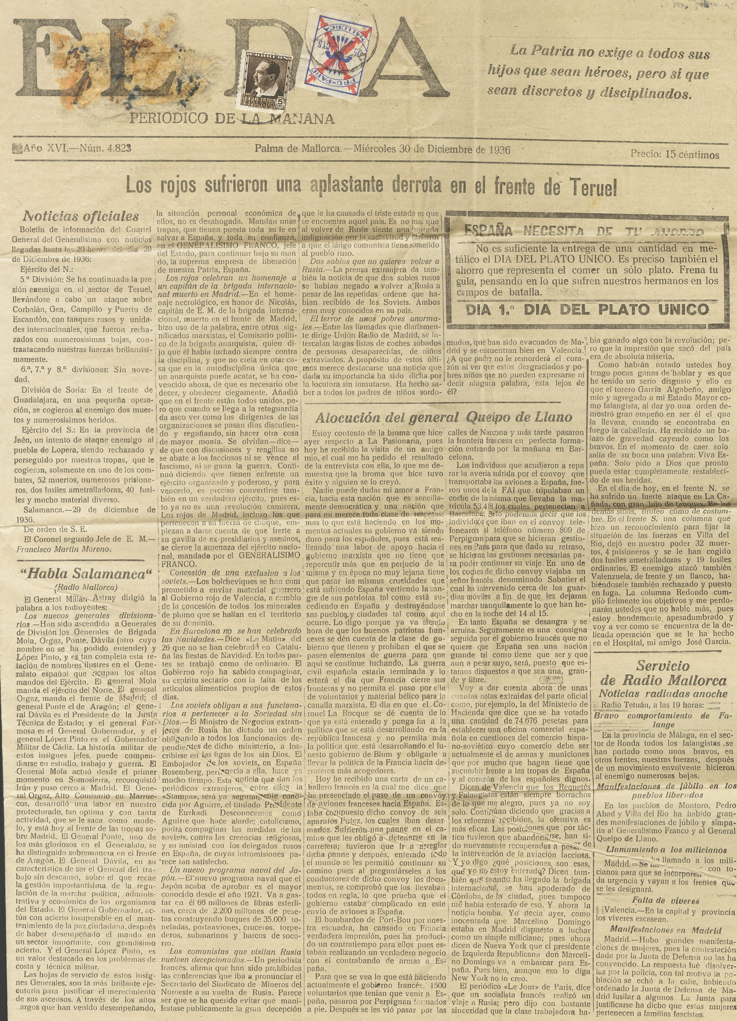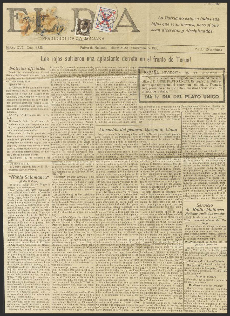 681. 1936. 5 cts chestnut and 5 cts blue and red Local. "EL DIA" newspaper from PALMA DE MALLORCA (recipient's label missing). BEAUTIFUL AND RARE.