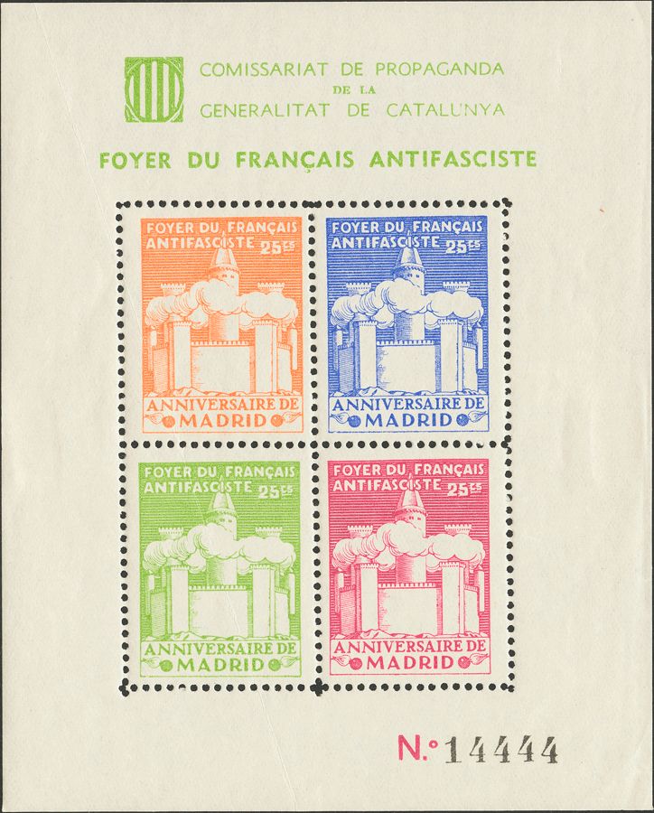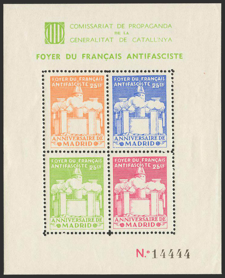 English ★1937. Block sheet. FOYER DU FRANCAIS ANTIFASCISTE, ANNIVERSARY OF MADRID. MAGNIFICENT AND RARE. (Guillamon 2269).