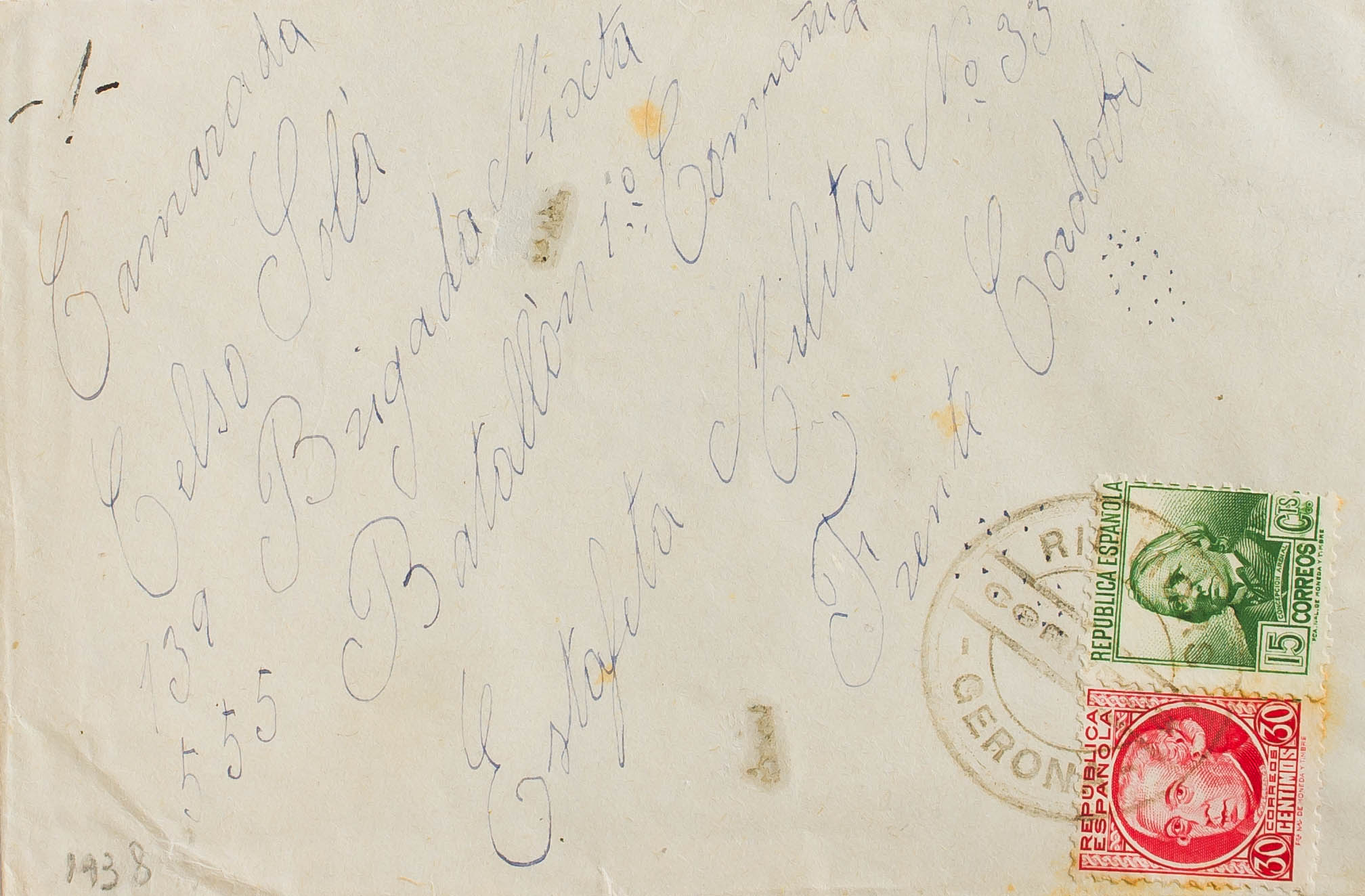 687, 733. (1936ca). 30 cts carmine and 15 cts green. RIUMORS (CORDOBA) to "The Córdoba Front". Postmark RIUMORS / CORREOS / GERONA. MAGNIFICENT AND VERY RARE.
