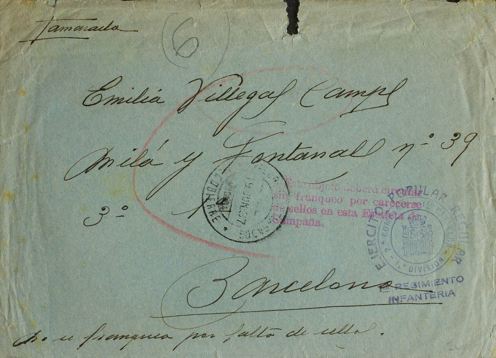 1937. ALCUBIERRE (HUESCA) to BARCELONA. Mark REGULAR PEOPLE'S ARMY / 2nd COMPANY 1st BATTALION / 1st DIVISION / 1st REGIMENT / INFANTRY, in violet and mark THIS OBJECT SHOULD BE CIRCULAR / WITHOUT POSTAGE DUE TO LACK / OF STAMPS IN THIS POST OFFICE OF / CAMPAIGN. MAGNIFICENT AND RARE.