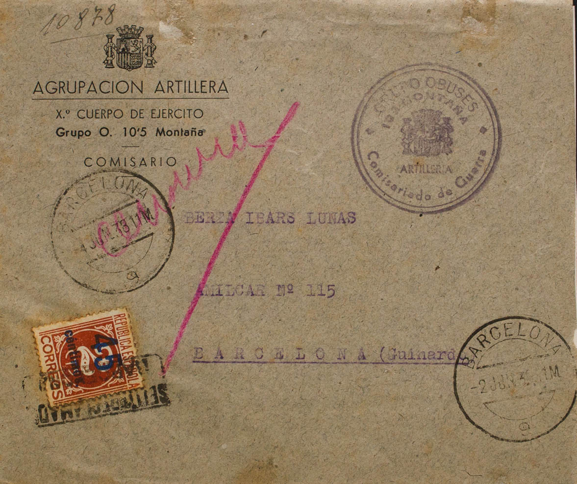 744. 1938. 45 cts over 2 cts chestnut. Addressed to BARCELONA. Franchise mark GRUPO OBUSES / 10´5 MONTAÑA / ARTILLERIA / WAR COMMISSIONER, in violet, the franchise is not accepted, the corresponding postage being claimed and the claimed stamp with the POSTMARK CLAIMED SEAL / BARCELONA unused. MAGNIFICENT AND VERY RARE.