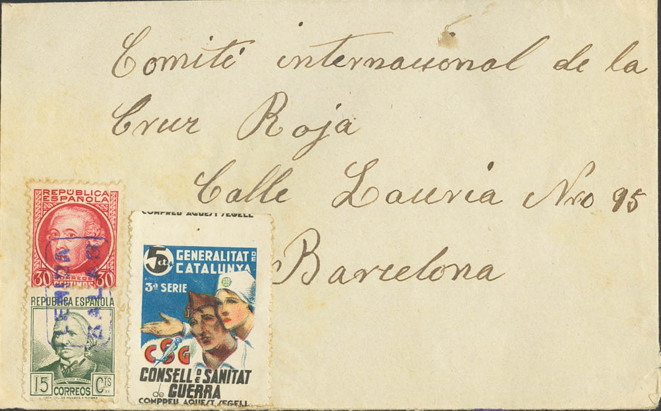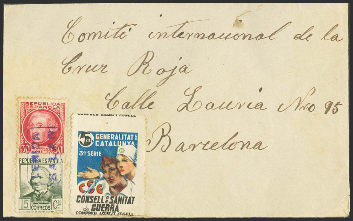 (1937ca). 15 cts greenish gray, 30 cts carmine and vignette of 5 cts CSG SALAS DE PALLAS to BARCELONA. LERIDA / PALLAS letter postmark, in blue. MAGNIFICENT AND RARE.