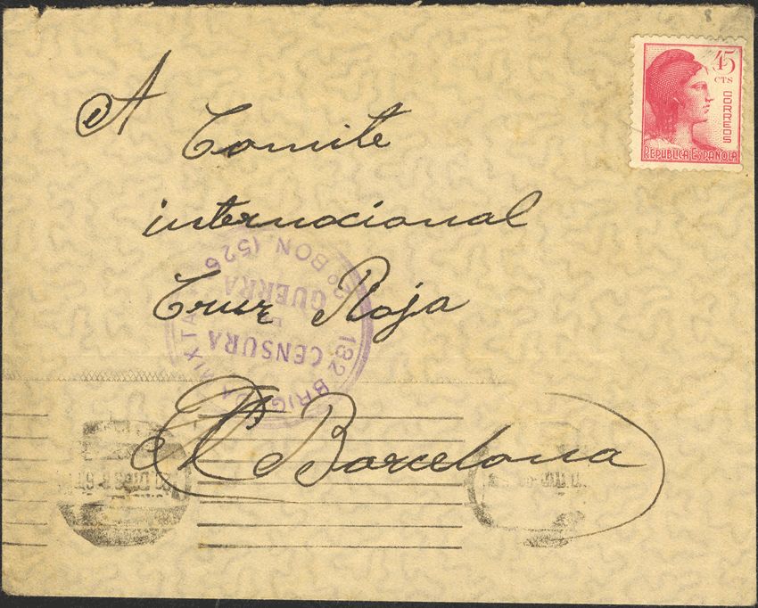 English 752. 1936. 45 cts. rose. TURIA BASE to BARCELONA. Mark 132ª MIXED BRIGADE / 2º BON (256) / CENSURA DE WAR. MAGNIFICENT.