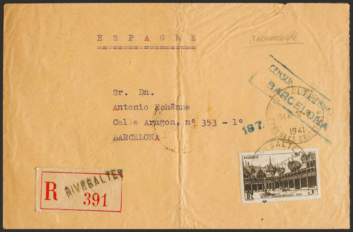 1941. 5 fr French chestnut. Certificate from RIVESALTES to BARCELONA. Sent from Campo (GTE 157) de Rivesaltes and arrival back. MAGNIFICENT AND UNUSUAL CERTIFIED LETTER FROM A REFUGEE CAMP.
