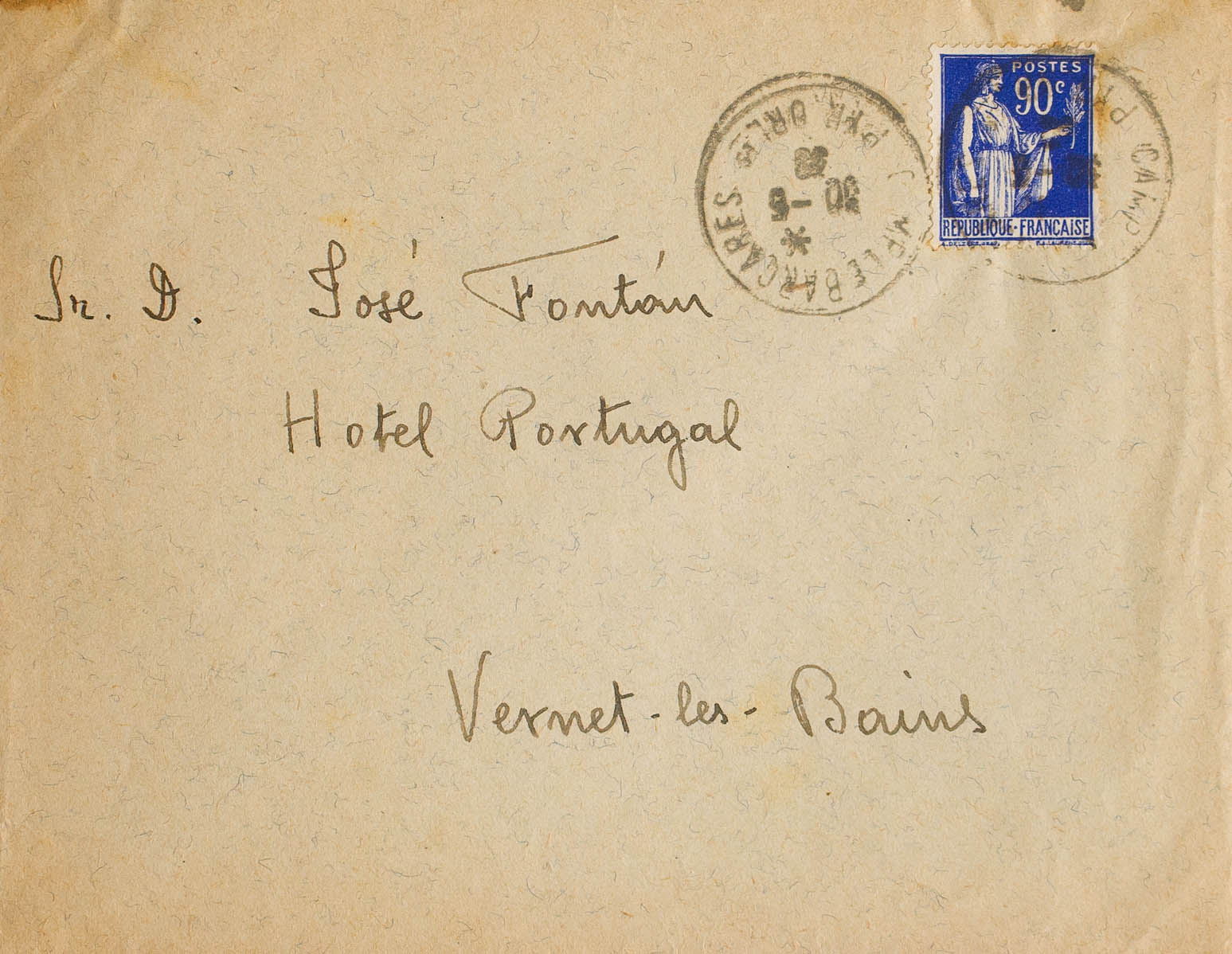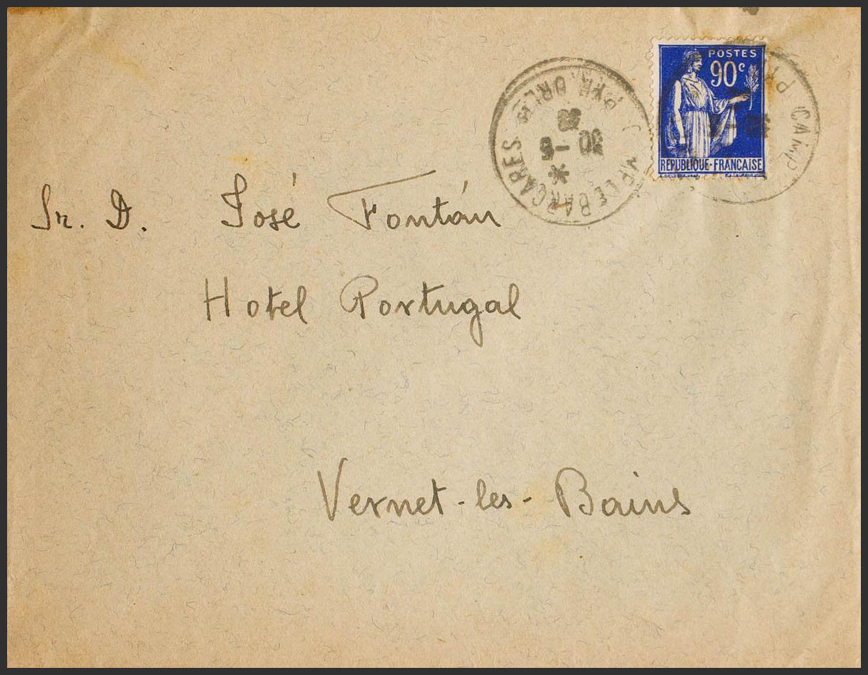1939. 90 blue cts from France. LE BARCARES to VERNET LES BAINS. CAMP LE BARCARES / PYR ORLES postmark and arrival backstamp. MAGNIFICENT.