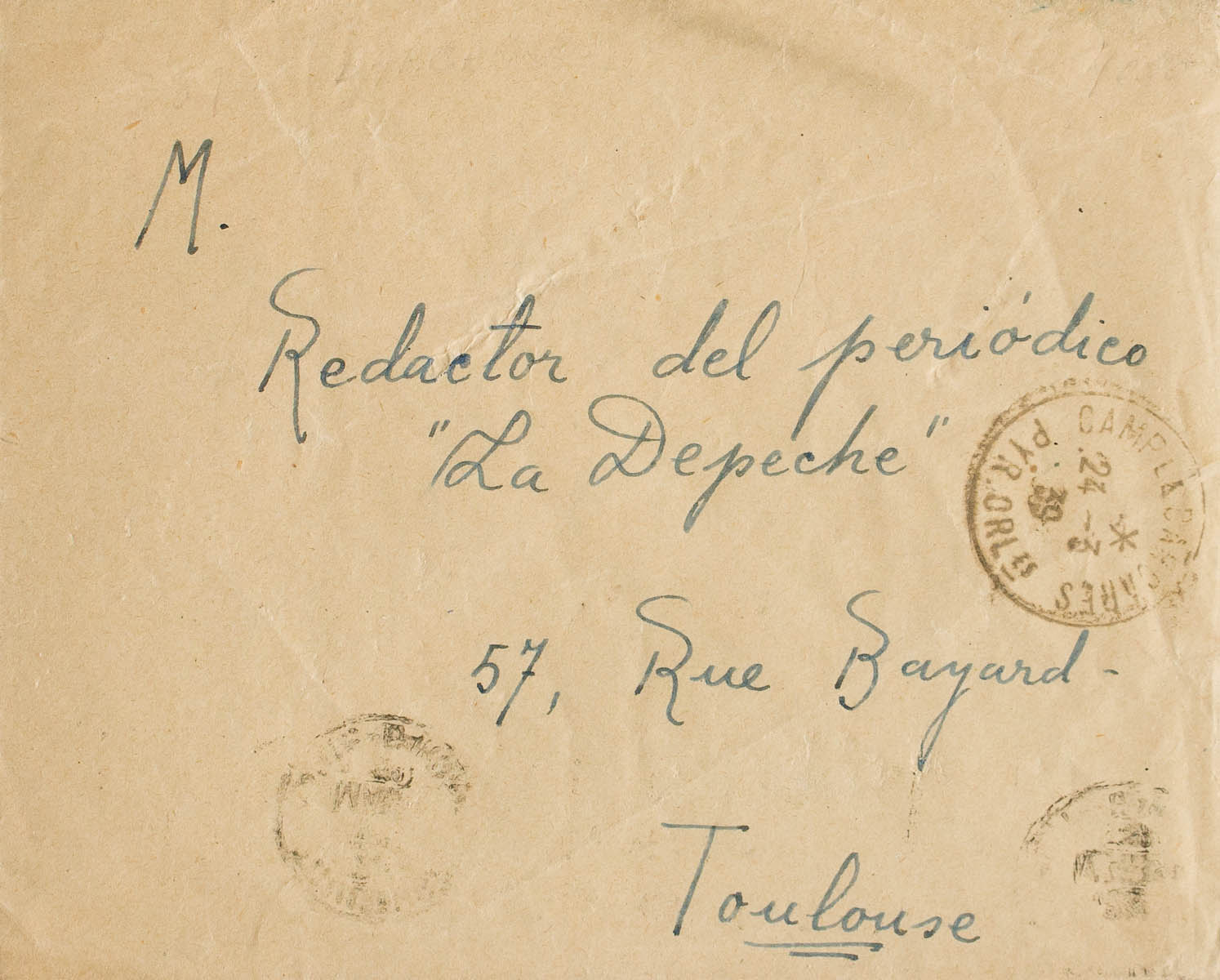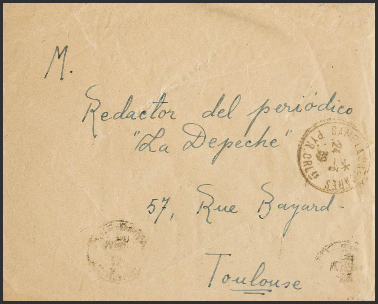 1939. LE BARCARES in TOULOUSE (FRANCE). CAMP LE BARCARES / PYR ORLES postmark and arrival backstamp. MAGNIFICENT.