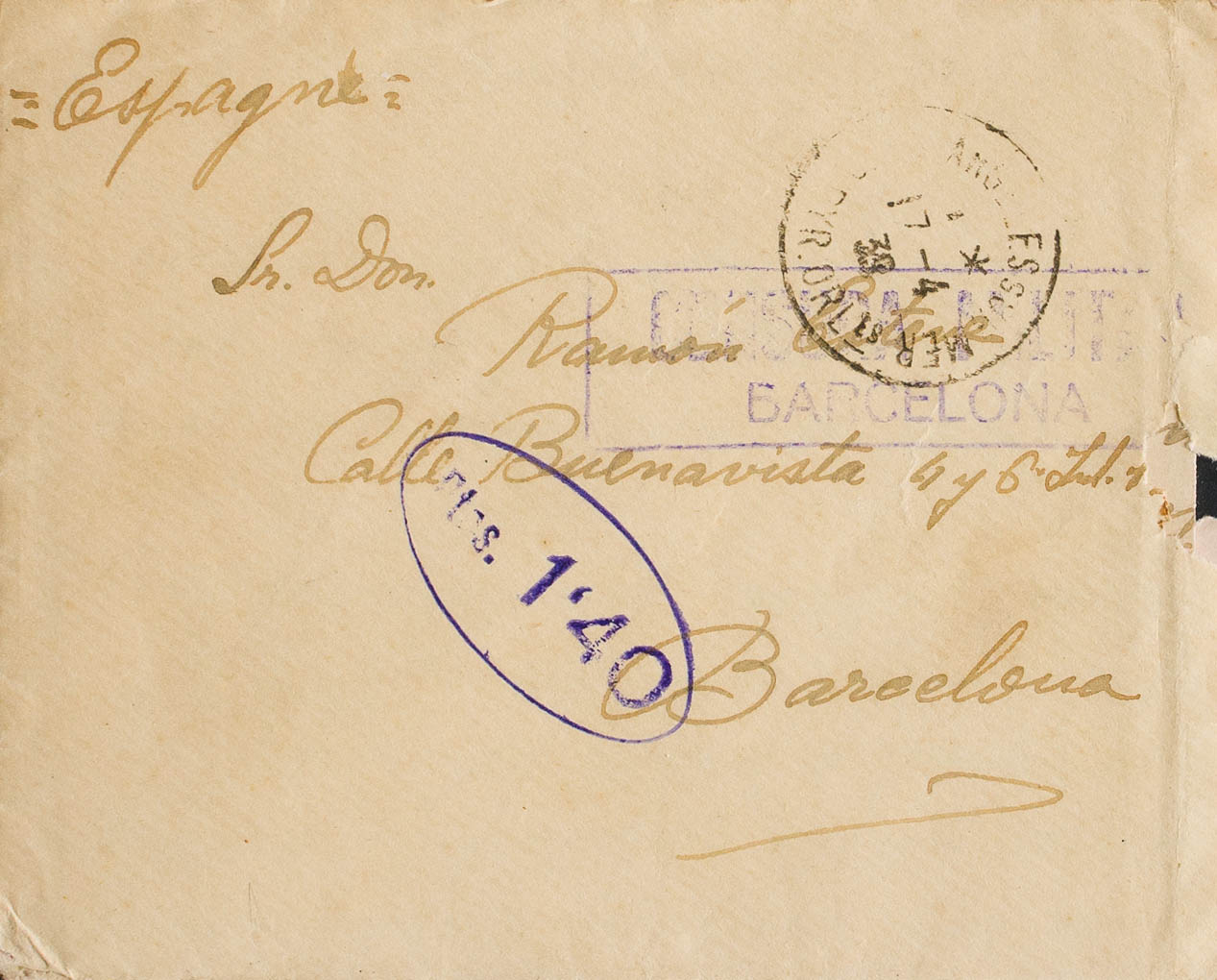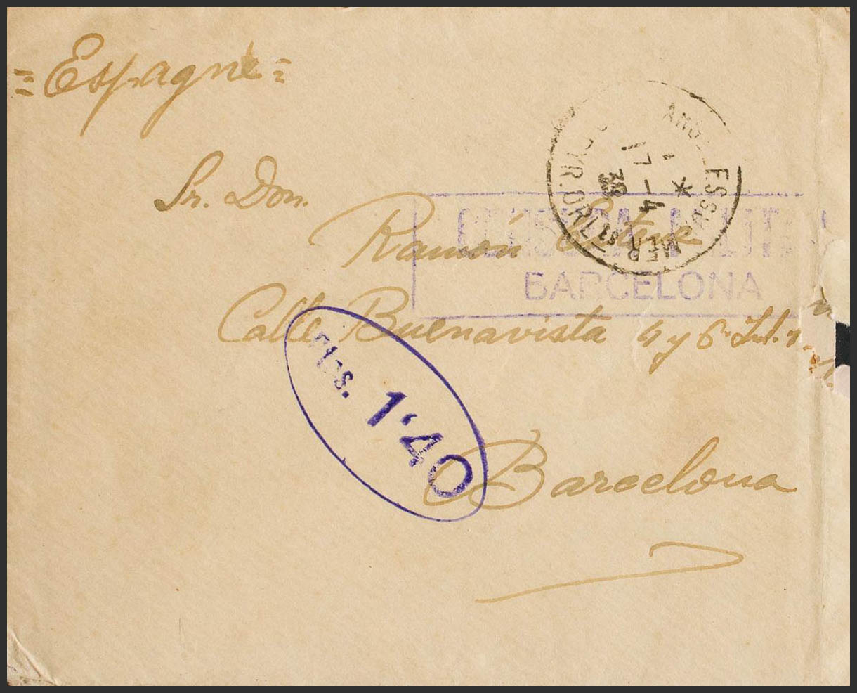 1939. ARGELES SUR MER in BARCELONA (text inside). Postmark ARGELES SUR MER / PYR ORLES and rate mark PTS 1´40, in violet applied on arrival. MAGNIFICENT AND VERY RARE.