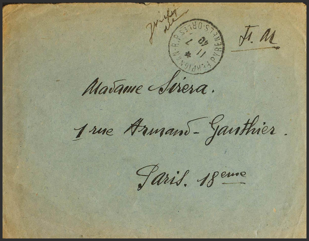 1940. PERPIÑAN to PARIS, probably written from one of the nearby Refugee Camps. Postmark PERPIGNAN RP / PYRENEES ORLES and manuscript FM MAGNIFICA.